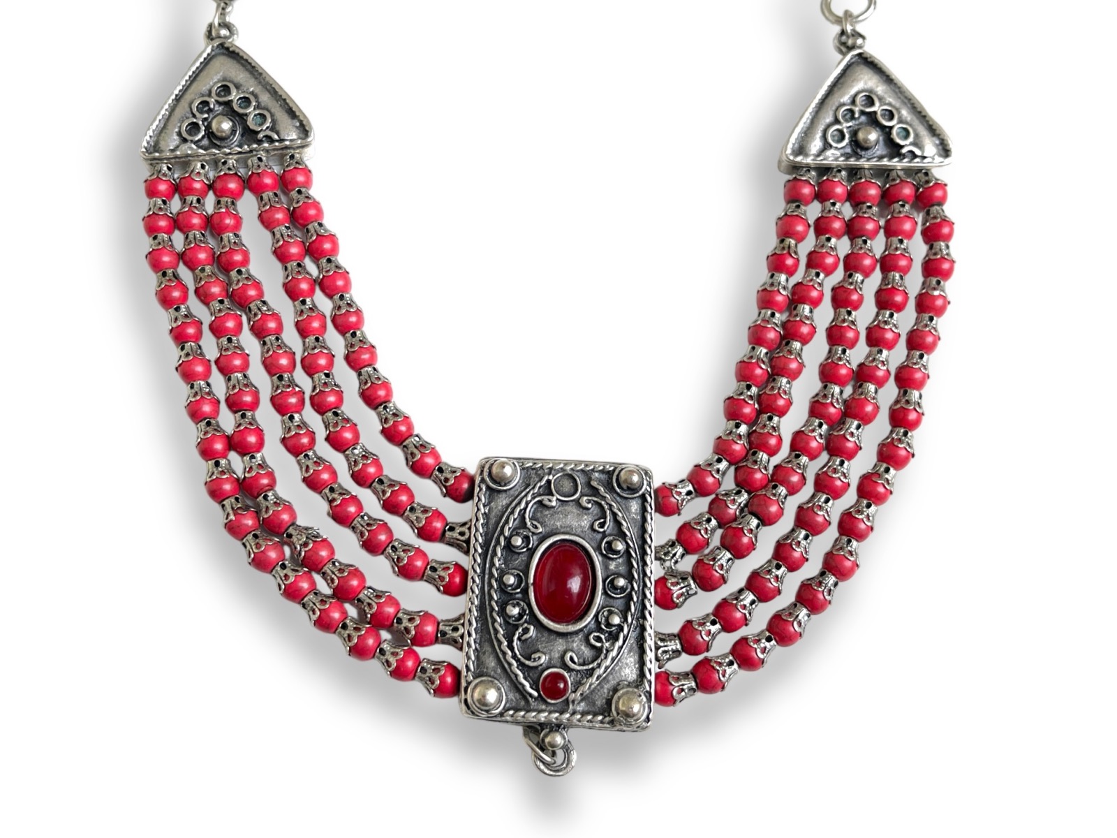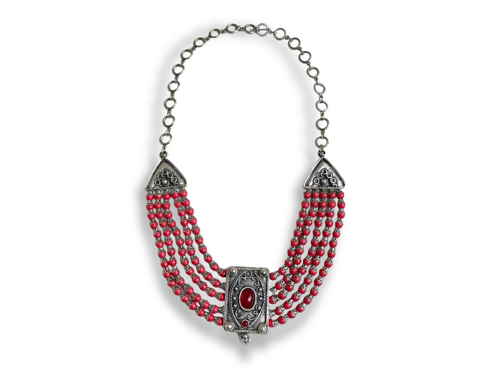 An old Yemeni Silvered Metal, (Nickel free), chains necklace with five strands of small red Glass round beads, each bead with a small Silvered Metal, patterned cover. At the base of the necklace is a Silvered Metal rectangular patterned panel, Inlaid with a red domed oval red Glass bead and a small round red Glass bead. At each end of the five strands, is a Silvered Metal triangular patterned panel. The rectangular panel is 3 cm in width, 0.5 cm in depth, and 4.5 cm in drop length. The two chains are, each , 16 cm in length, and the drop length of the necklace and chains is 29 cm. The necklace is finished with a Silvered Metal ‘T’ bar and rings, so the drop length of the necklace is adjustable.