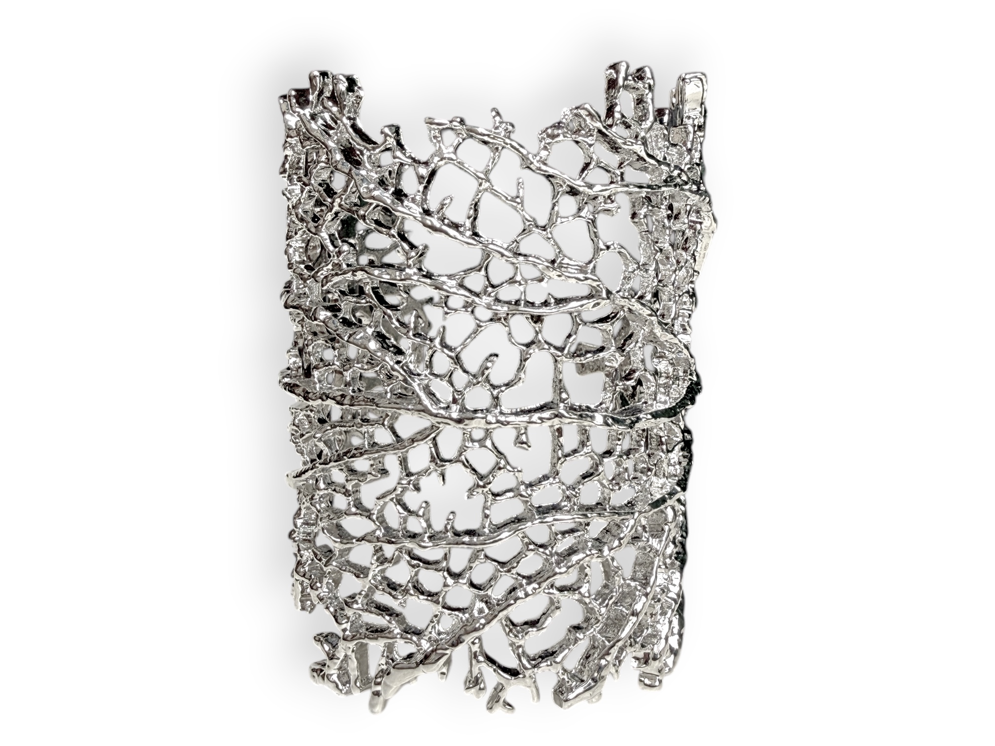 A Long Open Cuff With A Silvered Metal Band Of Skeleton Leaves.