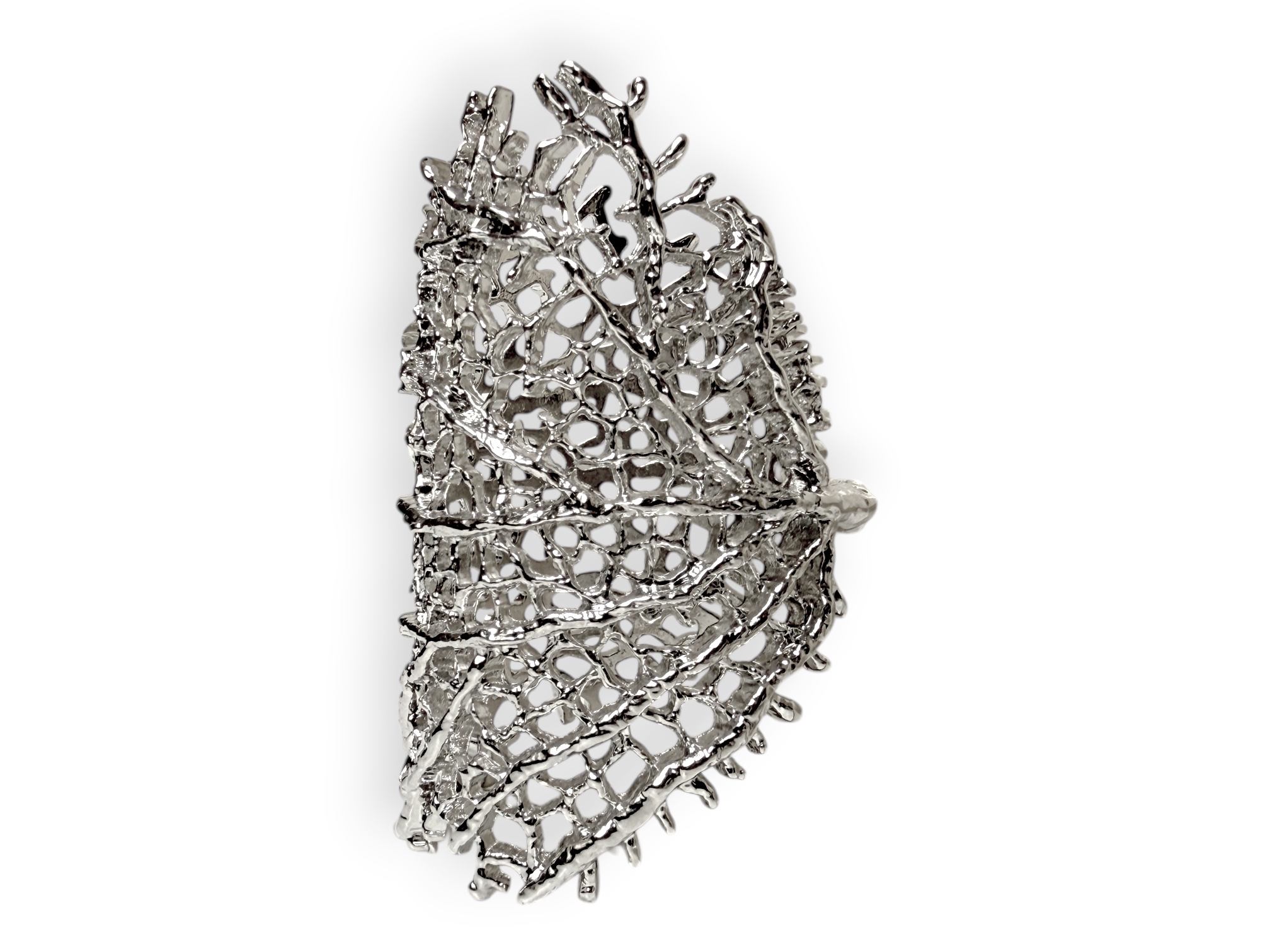 A long open cuff with a band of Silvered Metal, (Nickel free), skeleton leaves. The cuff is 8.5 cm in length, and the inner diameter of the cuff is 5.5 cm.