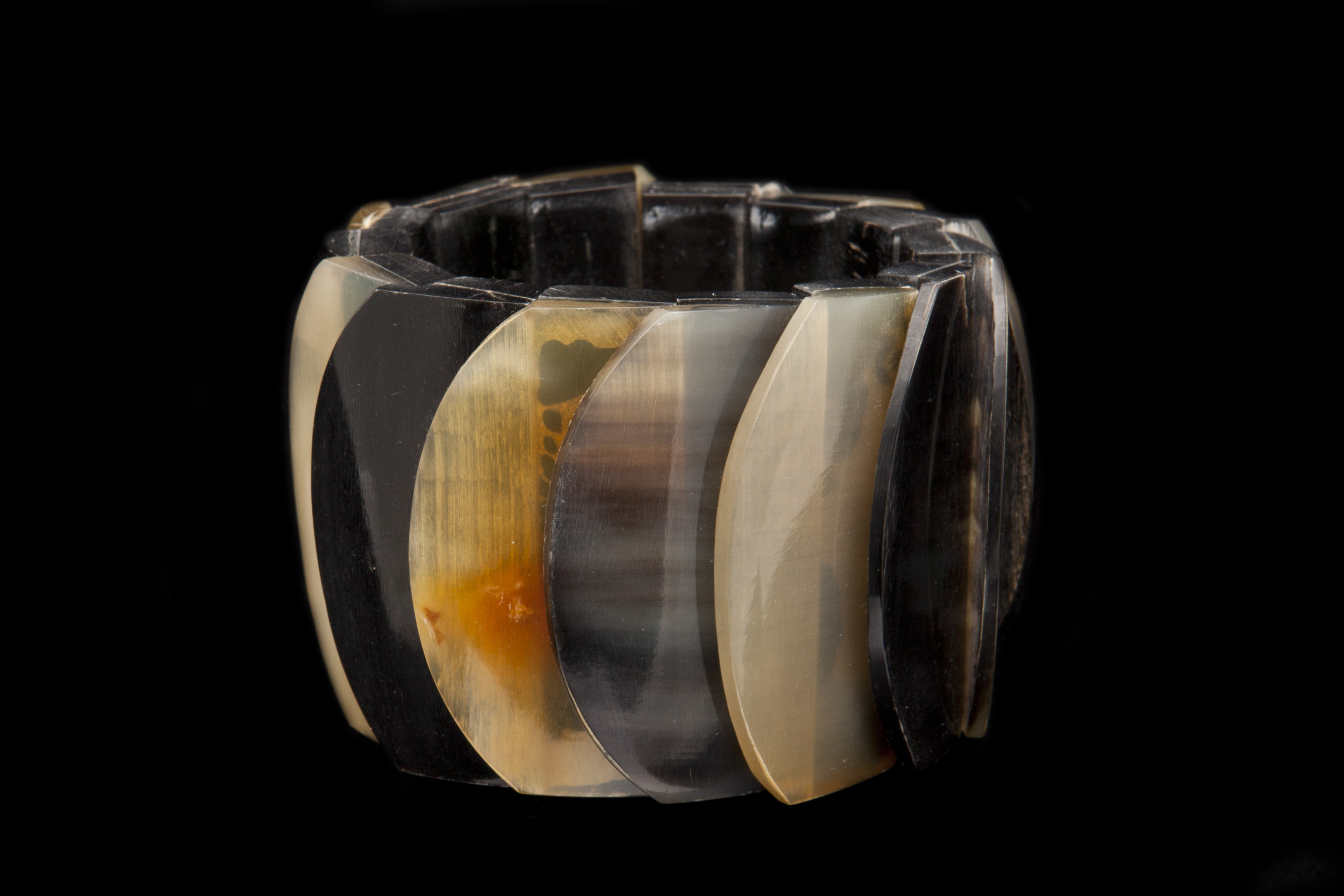 Buffalo0 Horn light and dark brown semi-circular curved slices,attached to a Black Buffalo Horn Rectangles elasticated bracelet. The inner diameter of the bracelet is 2 inches, (expands), and the outer diameter is 2.4 inches. The bracelet is 2.1 inches in width