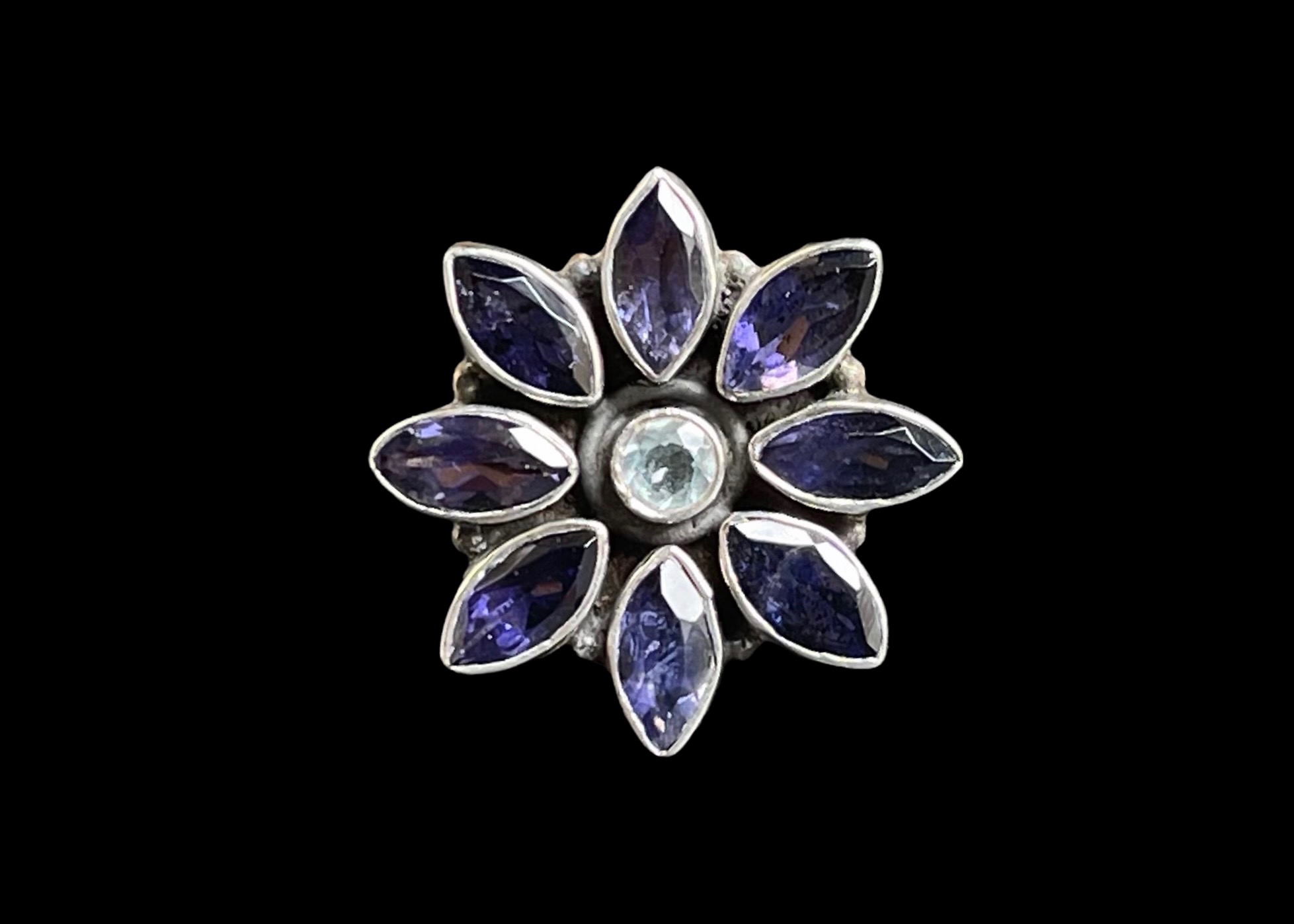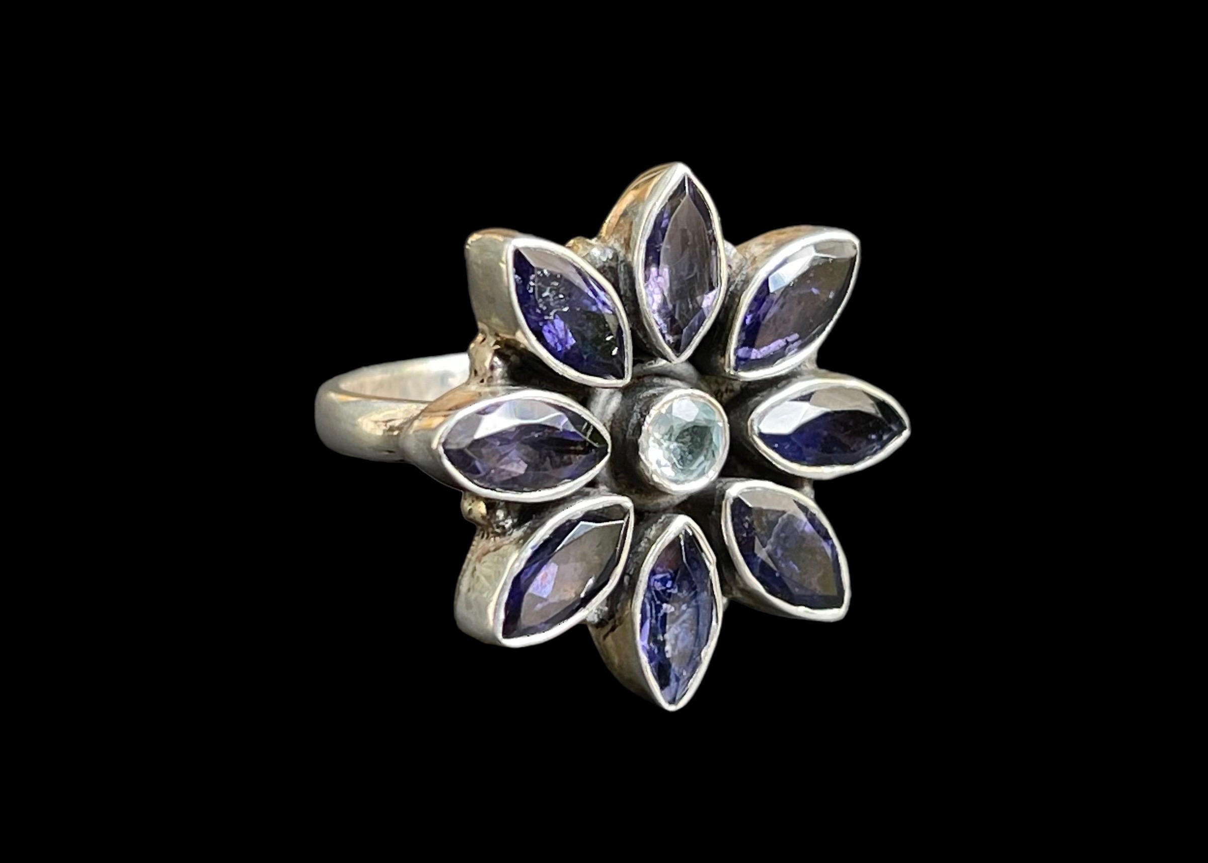 Faceted petal shaped iolite cabochons & small faceted circular aquamarine cabochon, set into a Sterling silver flower shaped ring.