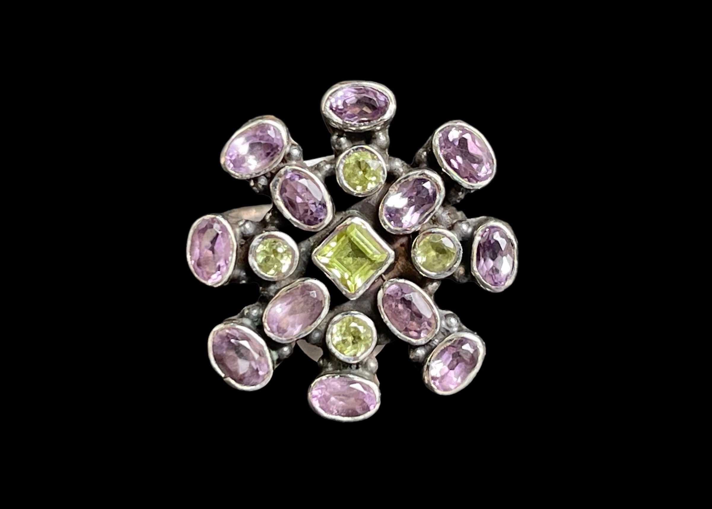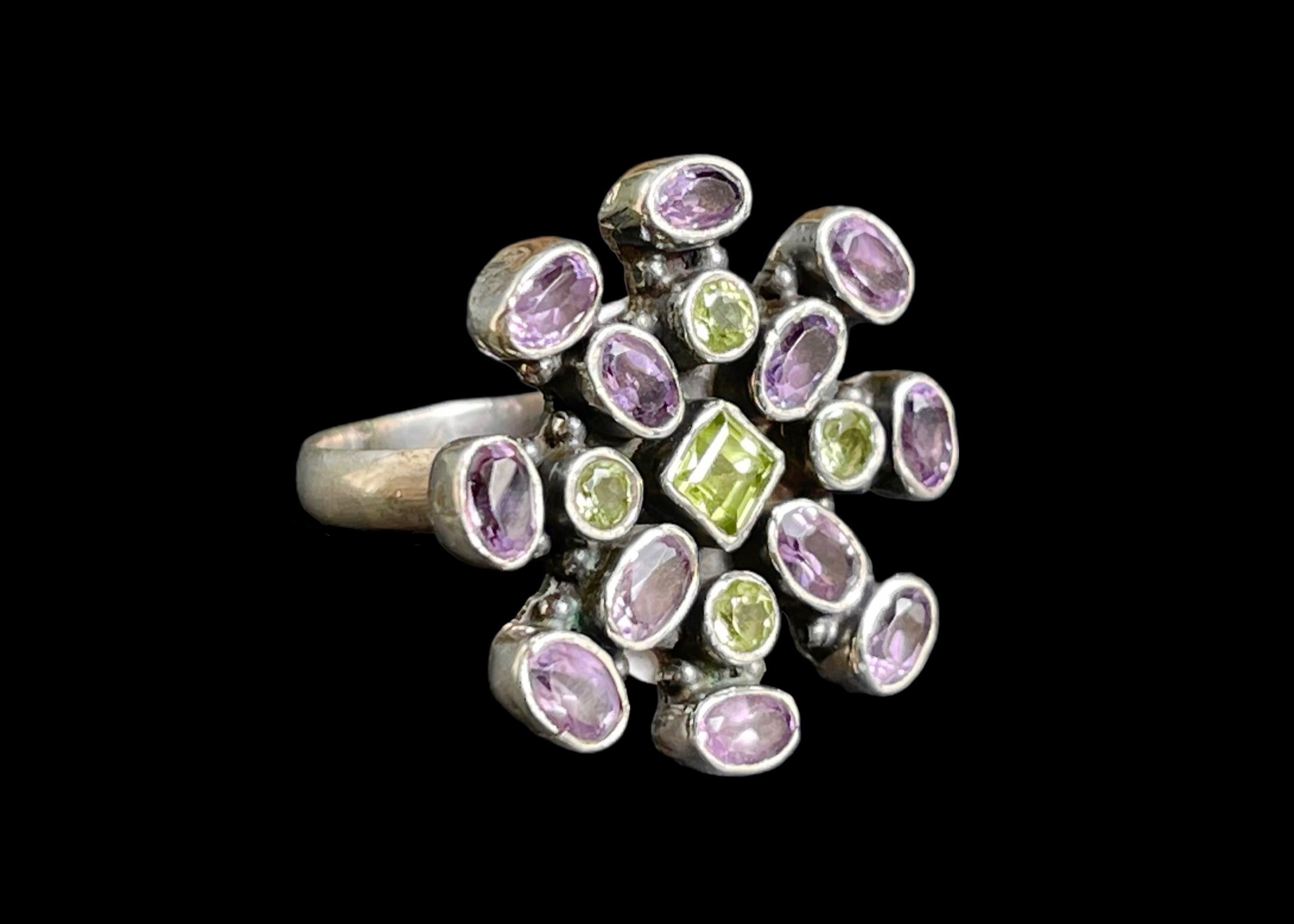 Faceted oval Amethyst cabochons & faceted circular Peridot cabochons, set into a Sterling silver ring.