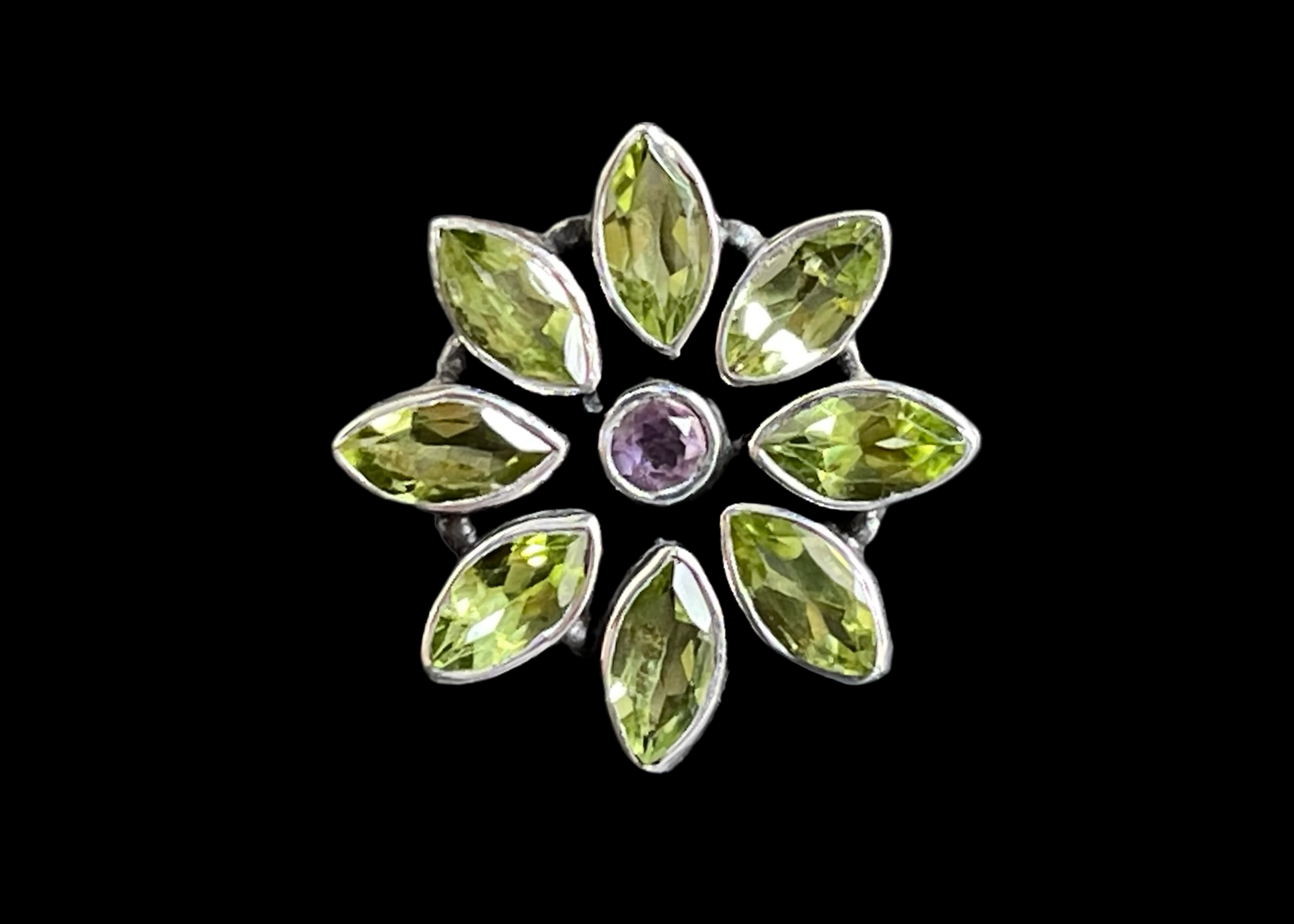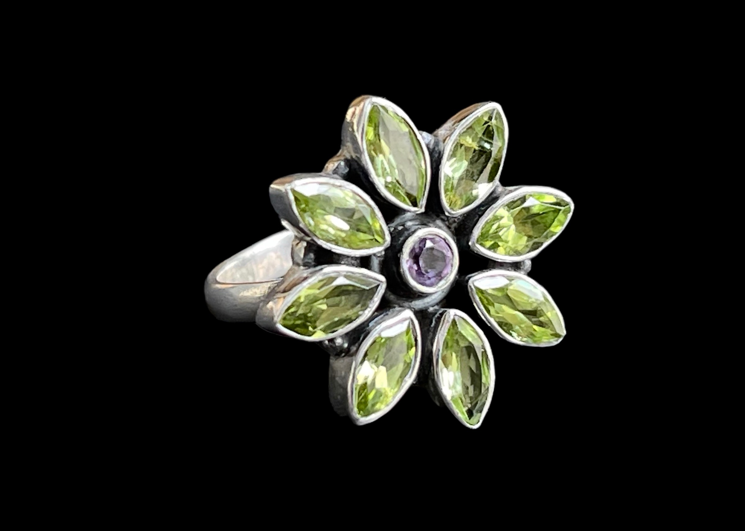 Faceted petal shaped peridot cabochons & small faceted circular amethyst cabochon, set into a Sterling silver flower shaped ring.