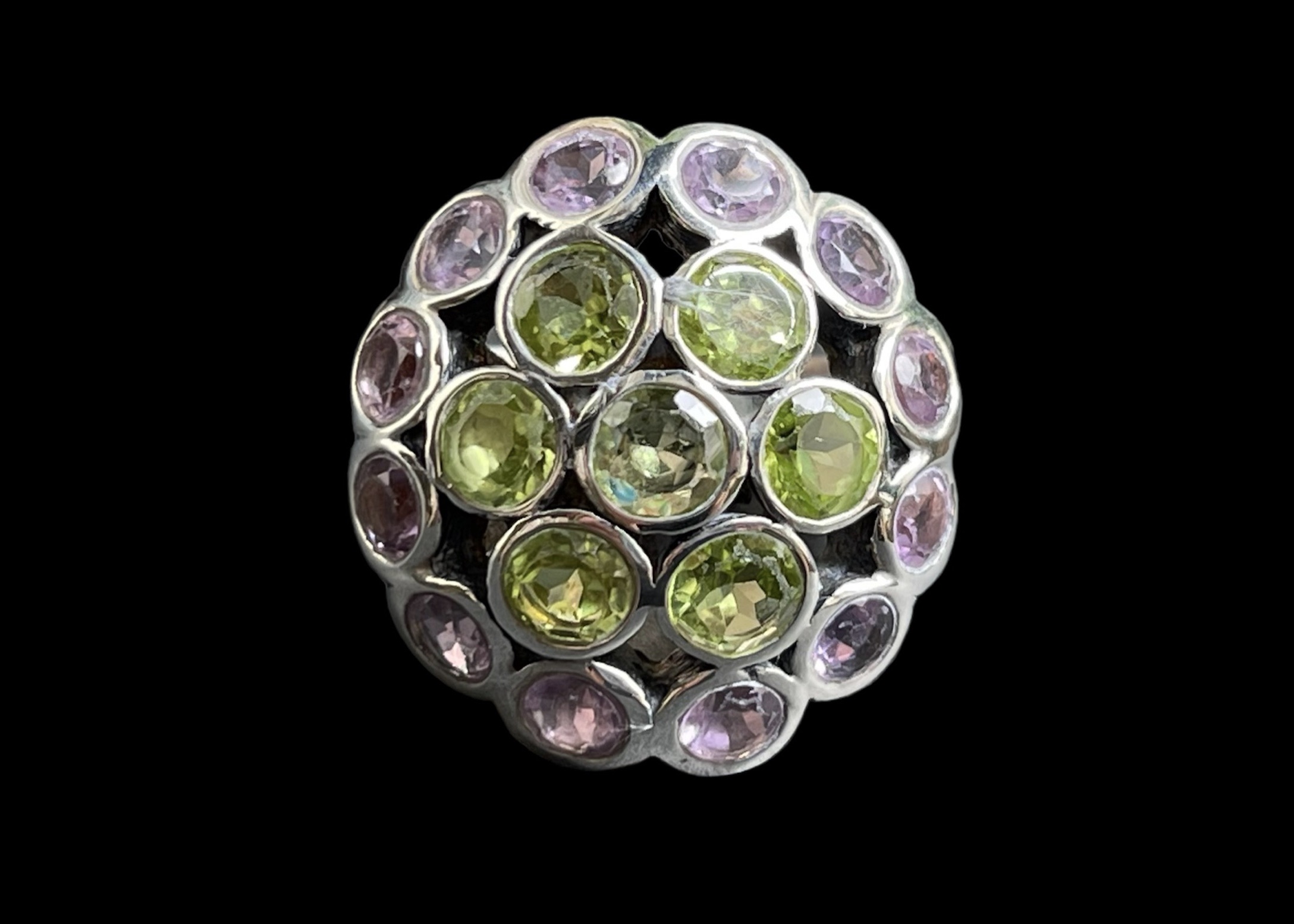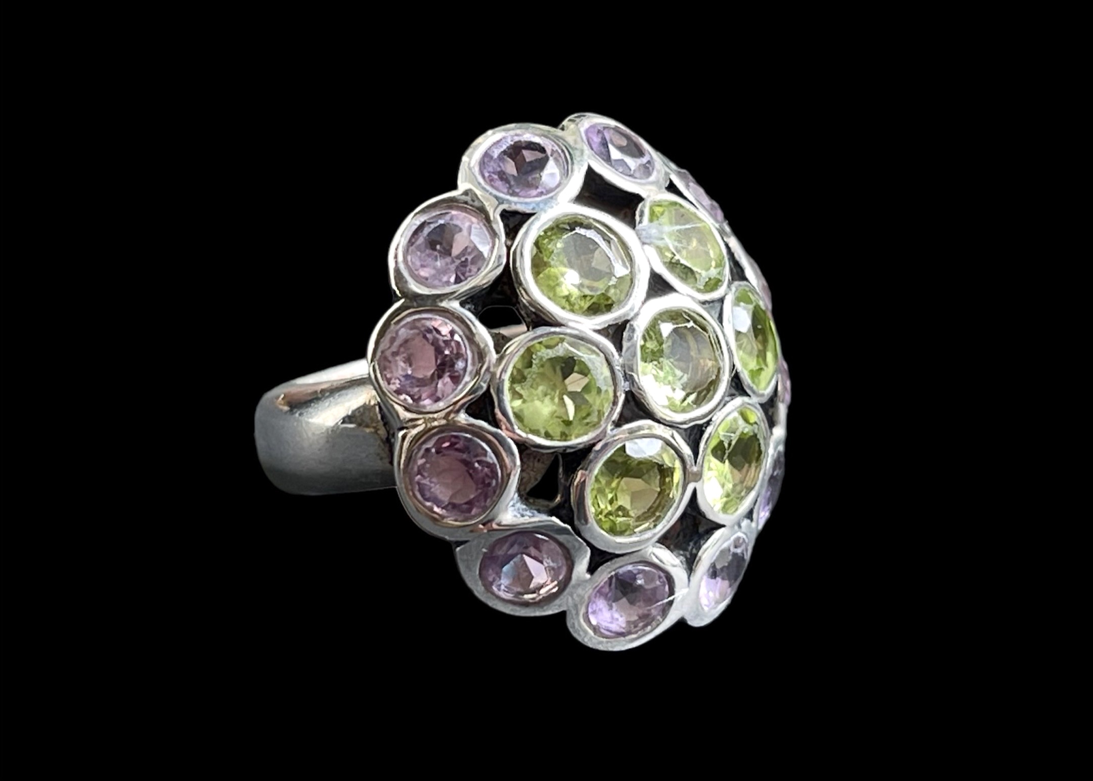 Faceted circular amethyst & peridot cabochons, set into a Sterling silver domed circular ring.