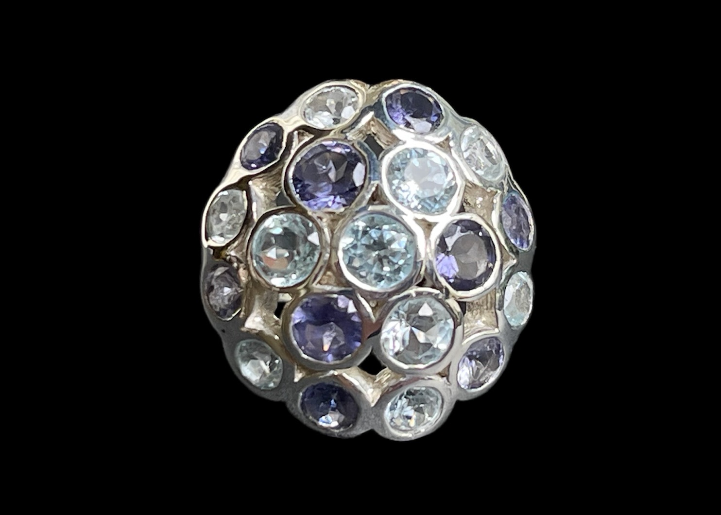 Facetted Topaz & Iolite Set Into A Sterling Silver Domed Circular Ring