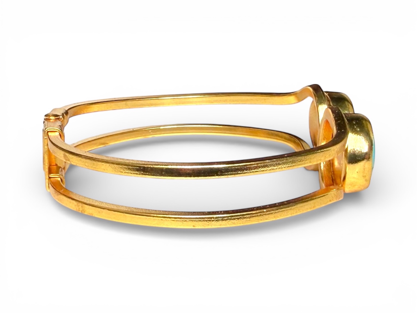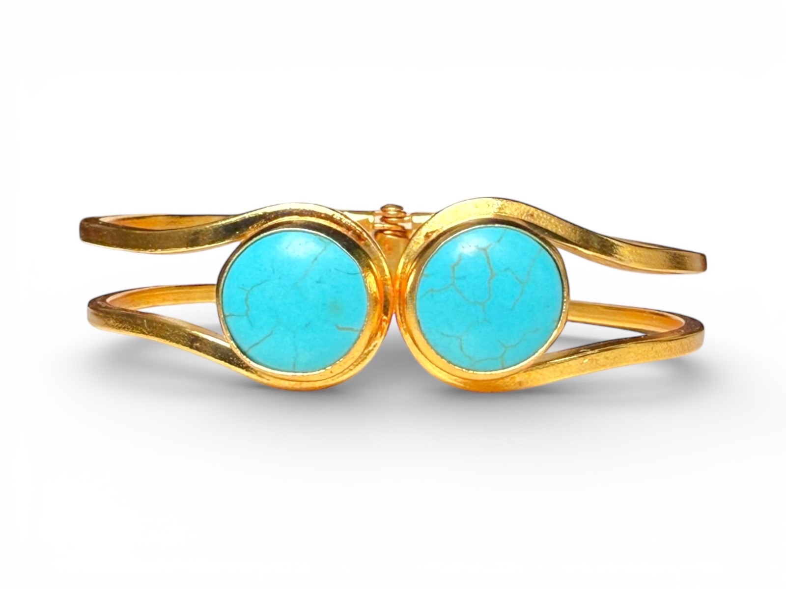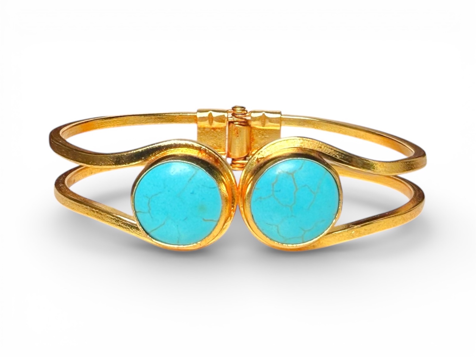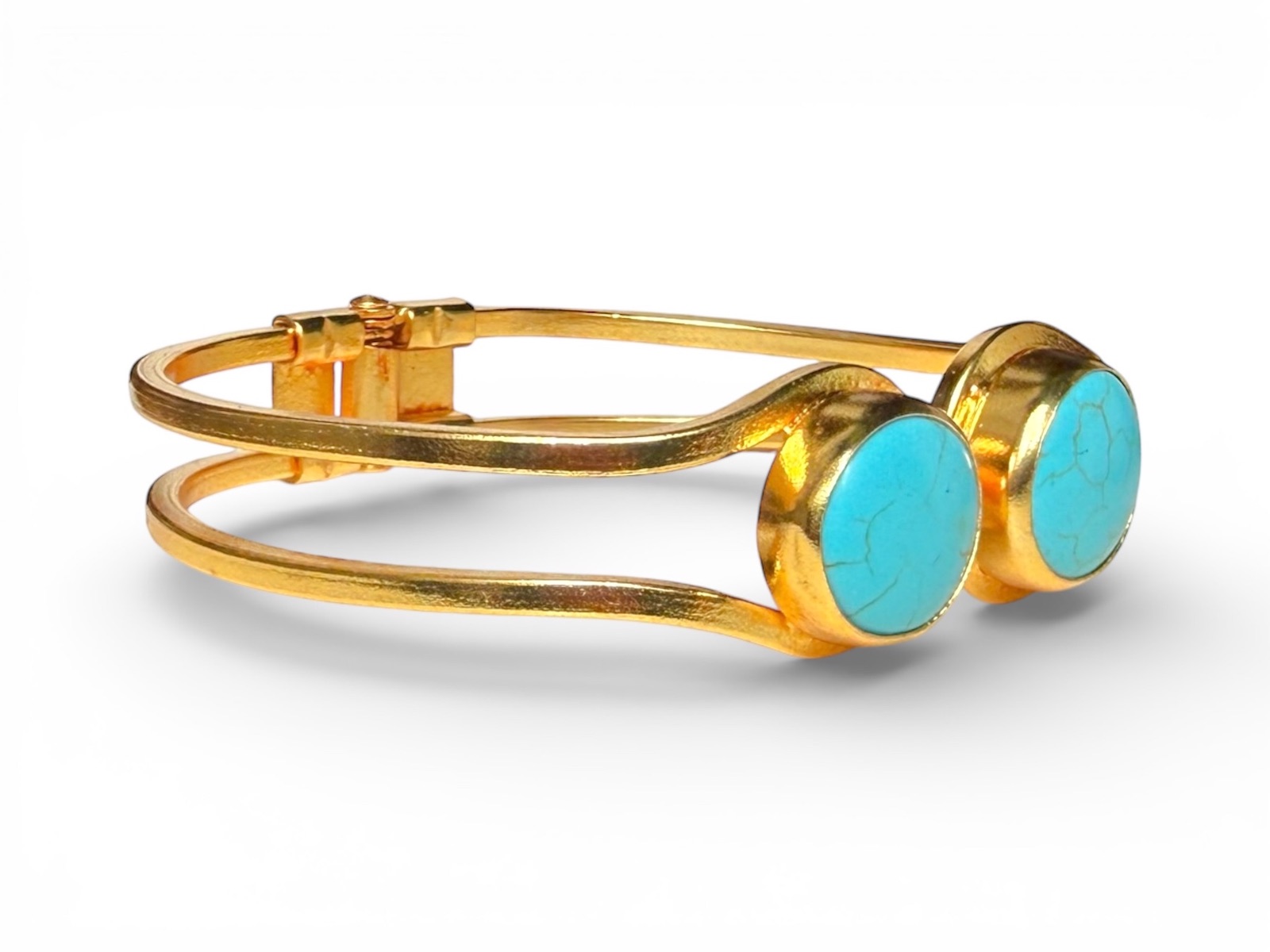 Gold plated two banded hinged cuff with two turquoise dyed howlite circular cabochons