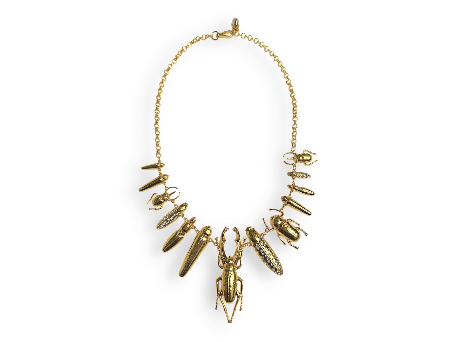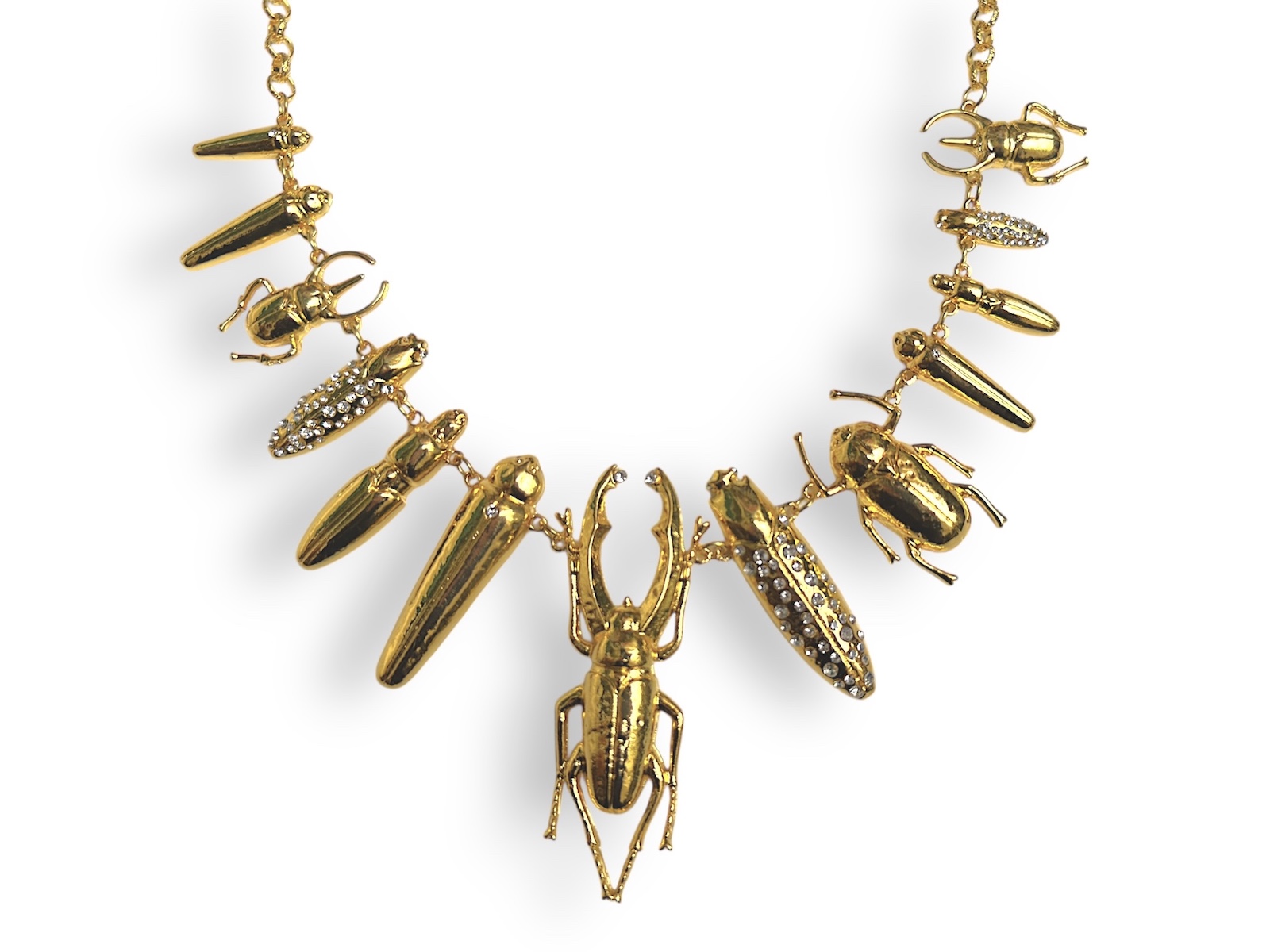Gold plated long textured belcher chain necklace with thirteen assorted chain linked gold plated beetles, three are inlaid with clear facetted glass cabochons