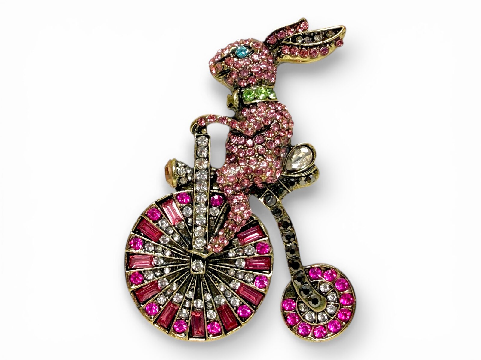 Golden metal pin brooch of a rabbit riding a bicycle inlaid with pink and clear facetted cabochons