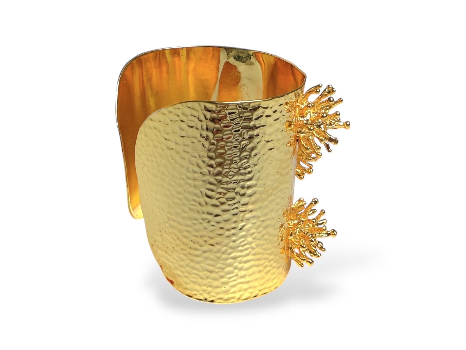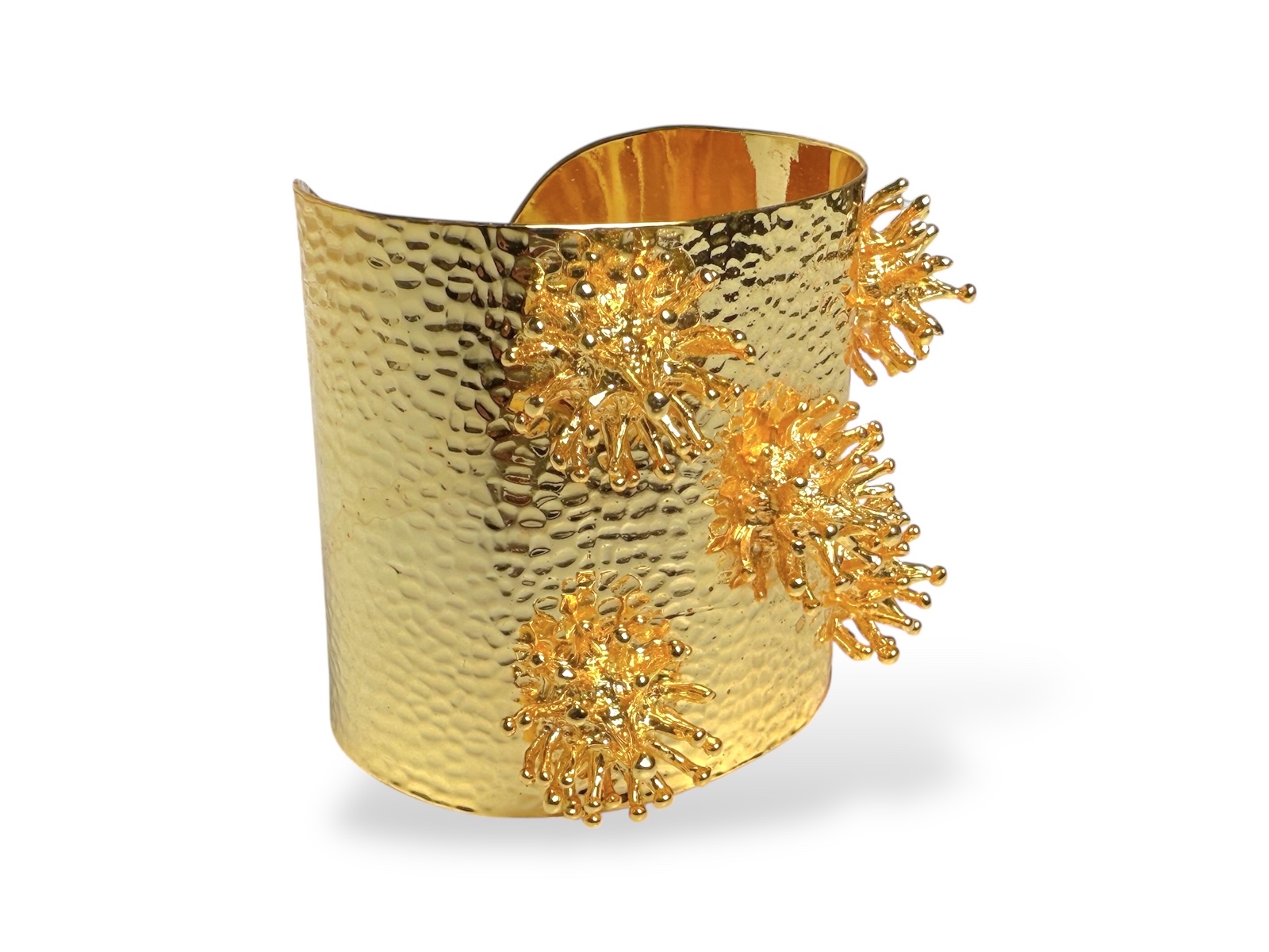 A Golden Metal, (Nickel free), hammered surface open cuff with five groups of clustered thin vertical bands with small round bead finials.