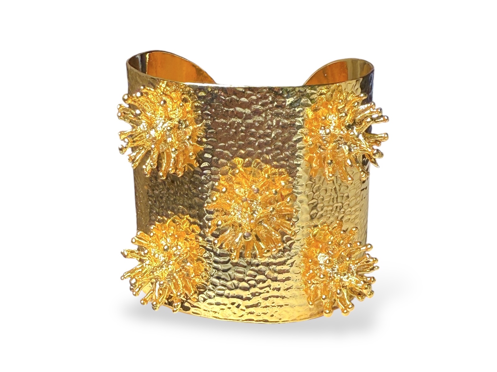 A Golden Metal, Hammered Surface, Open Cuff With Five Circular Clusters Of Thin Vertical Bands With Small Round Bead Finials.