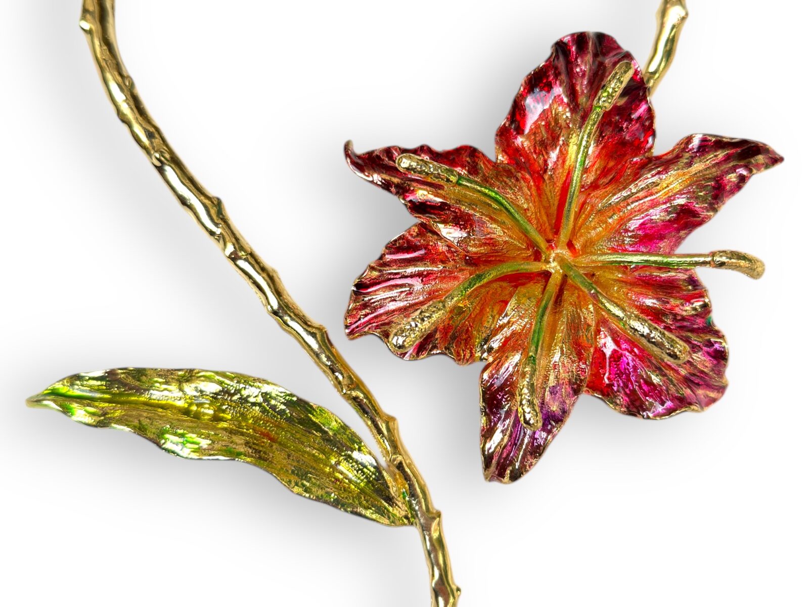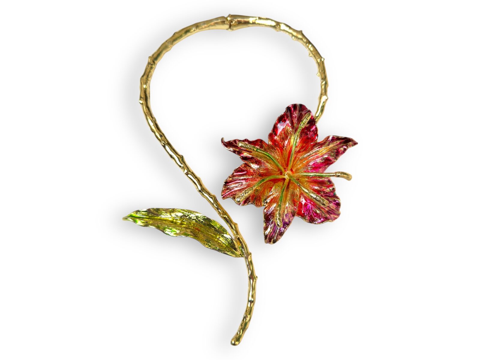 Golden metal hinged torque necklace with large enamel painted lily and single leaf attached to the main stem of the necklace