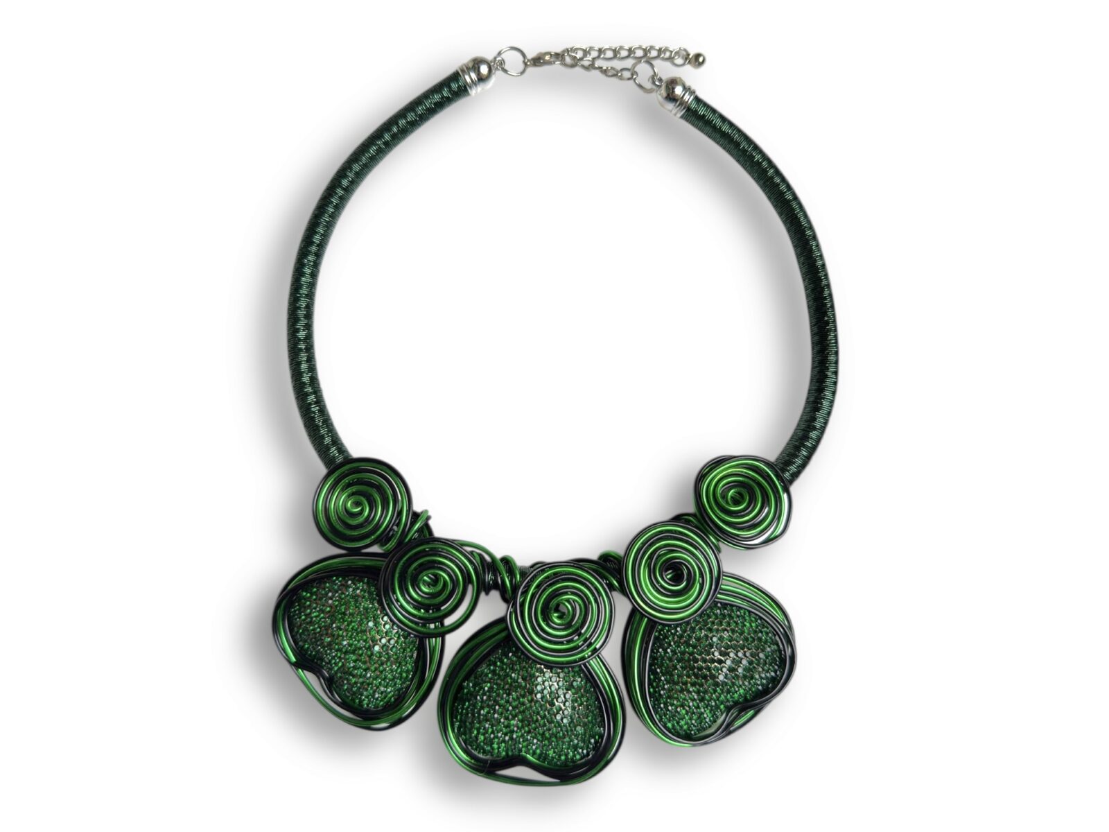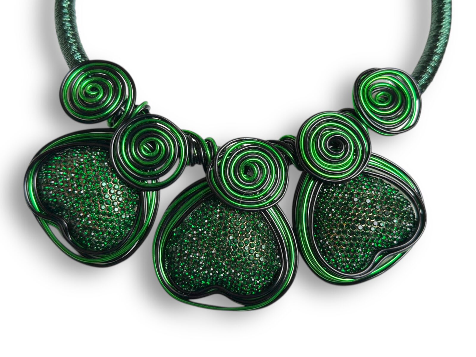 Metallic green cord necklace with three hearts inlaid with facetted green glass cabochons with borders and five coils of green and black wire