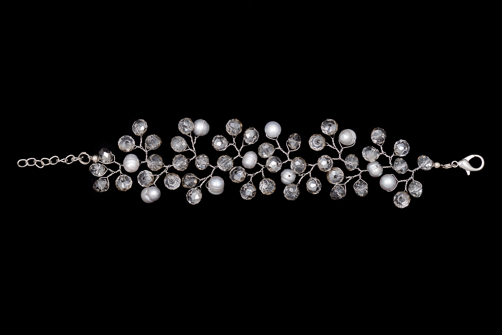 A Silver Plated wires bracelet, decorated with clear facetted Glass domed circular beads and silver Freshwater Pearls. The bracelet is 1.5 inches in width, 6.2 inches in length, and is finished with a Silver Plated oyster clasp, and a 1.2 inch chain, so the length can be adjusted up to 7.4 inches in length.