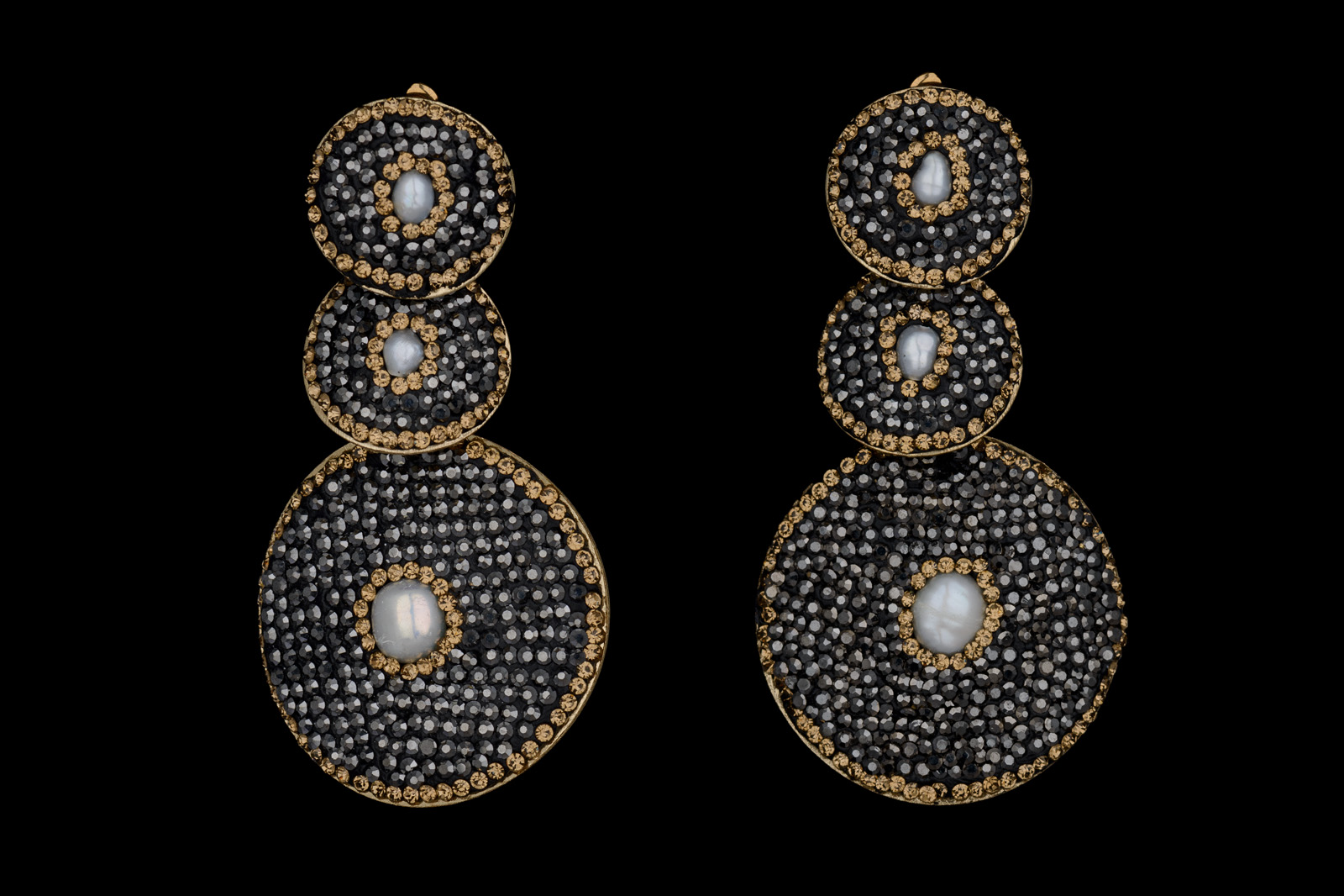 A pair of Brass earrings, of one large and two small, linked and overlapping circular discs. Each disc is inlaid with small facetted Marcasites and bordered with small facetted golden Glass beads. At the centre of each disc is a white Freshwater Pearl inlay.