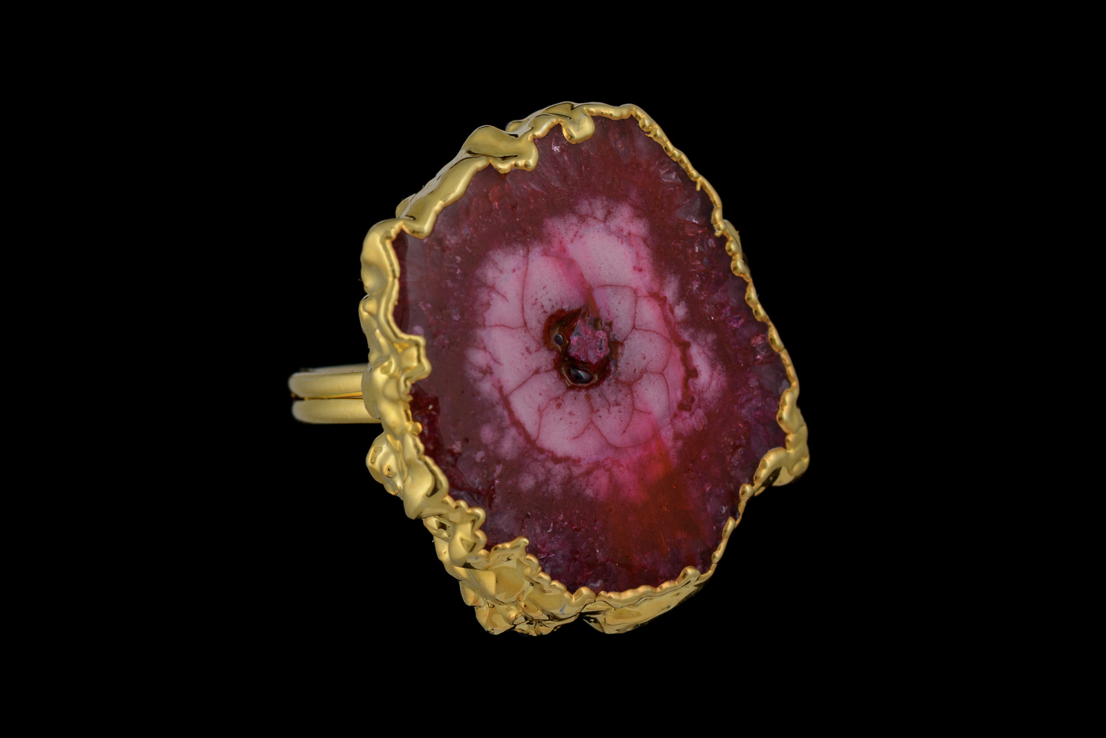 A Gold Plated open band ring, with a pink dyed, natural pattern, Solar Quartz sliced Crystal bezel with a Gold Plated irregular shaped border. The bezel is 0.6 inches in width, 0.7 inches in length, and the inner diameter of the ring band is 0.6 inches.