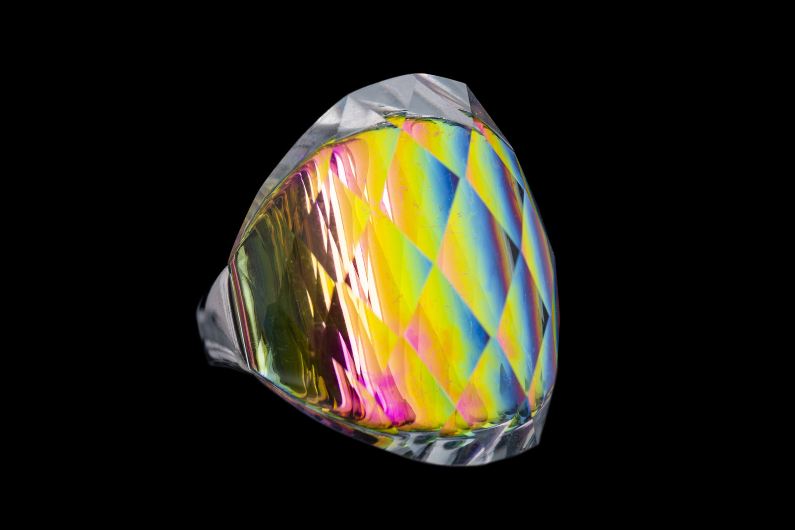 A large Chinese Silver Plated ring with a curved and tapered, facetted Glass oval bezel, set onto a curved, multicoloured patterned base. The Glass bezel is 1 inch in width, 0.2 inches in maximum height, and 1.2 inches in length, tapering down to 0.3 inches in length where the Glass bezel is attached to the Silver Plated band