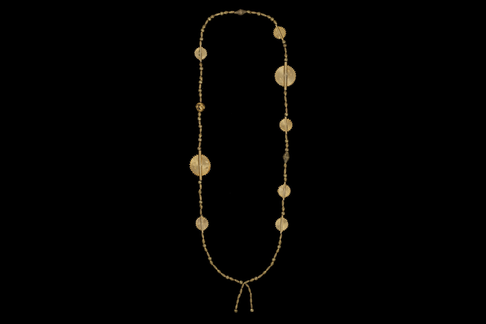 A long necklace of eight Akan Golden Metal, (Nickel free), mixed sized patterned ‘sun’ discs with tubular centres, three Baule Golden Metal patterned beads, and eighty Ethiopian small Brass ridged, tubular, and barrel Brass beads. At the base of the necklace are two strands of six Ethiopian Brass small tubular beads. The largest Akan discs are 1.5 inches in diameter and 2.2 inches in length. The necklace is 25 inches in drop length.