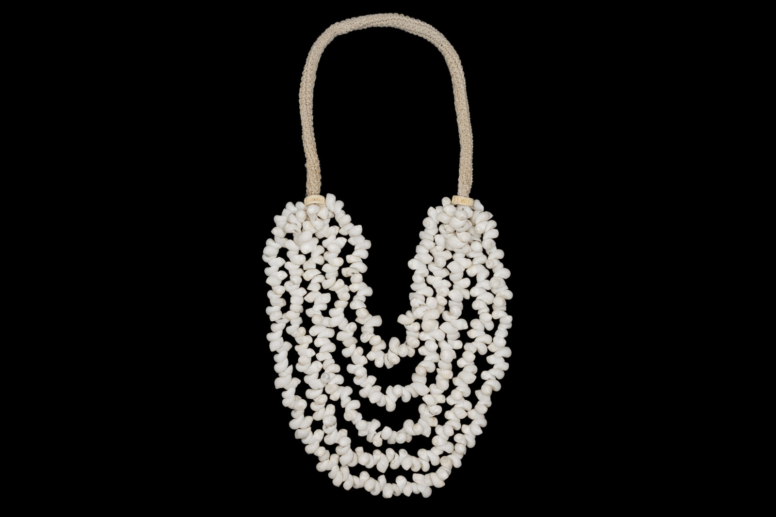 A New Guinea long necklace of cream coloured braided Rope, with five graduated strands of small white curled Shells. At the top of the graduated strand, on each side of the necklace, is a cream coloured, naturally patterned, Bone disc. The braided Rope is 0.4 inches in diameter. Each small white Shell is, approximately, 0.4 inches in width, 0.5 inches in length, and 0.2 inches in depth. The necklace has a drop length of 22.2 inches.