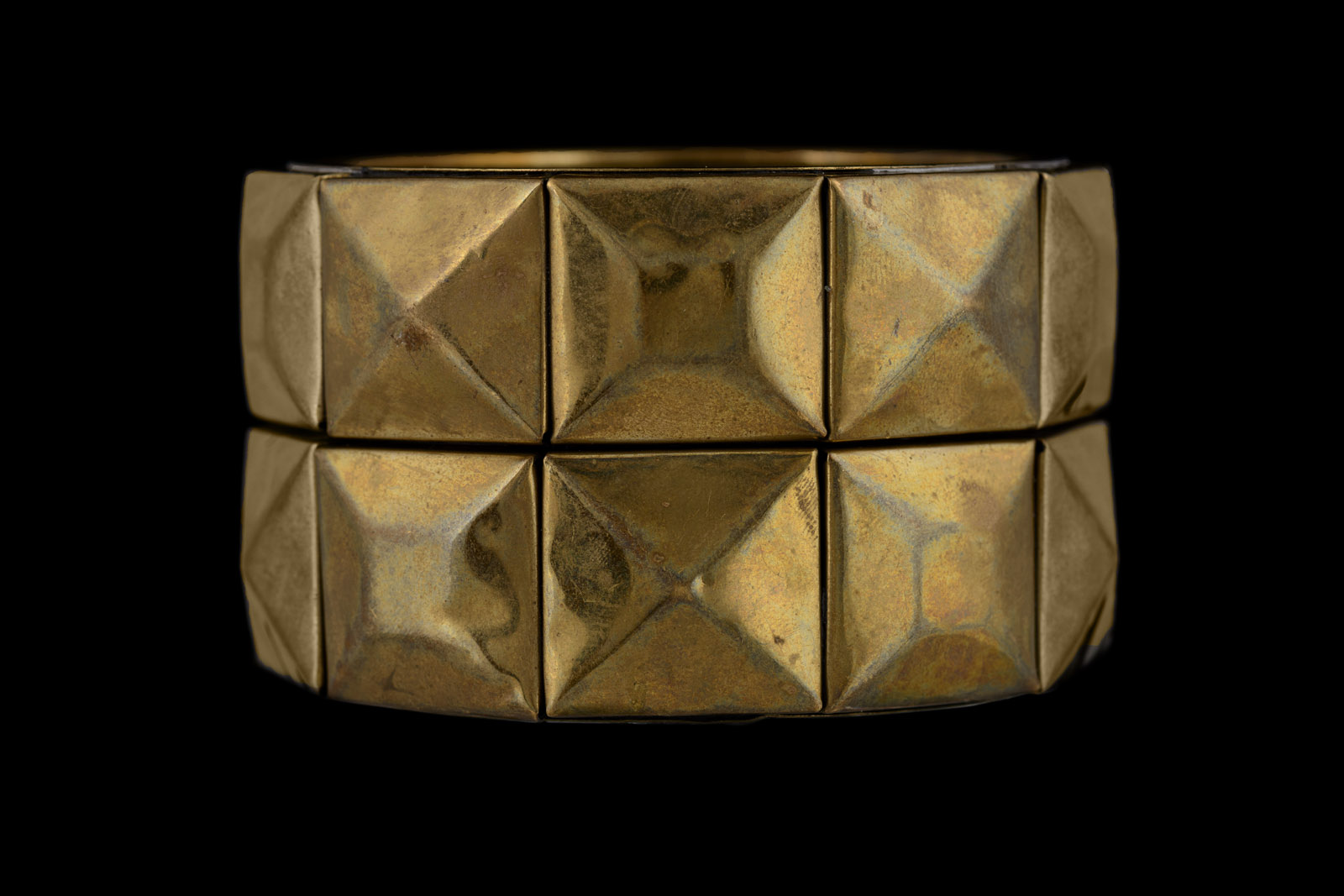 A Wide Brass Bangle Decorated With Two Rows Of Ten Square Ridged Brass Panels.