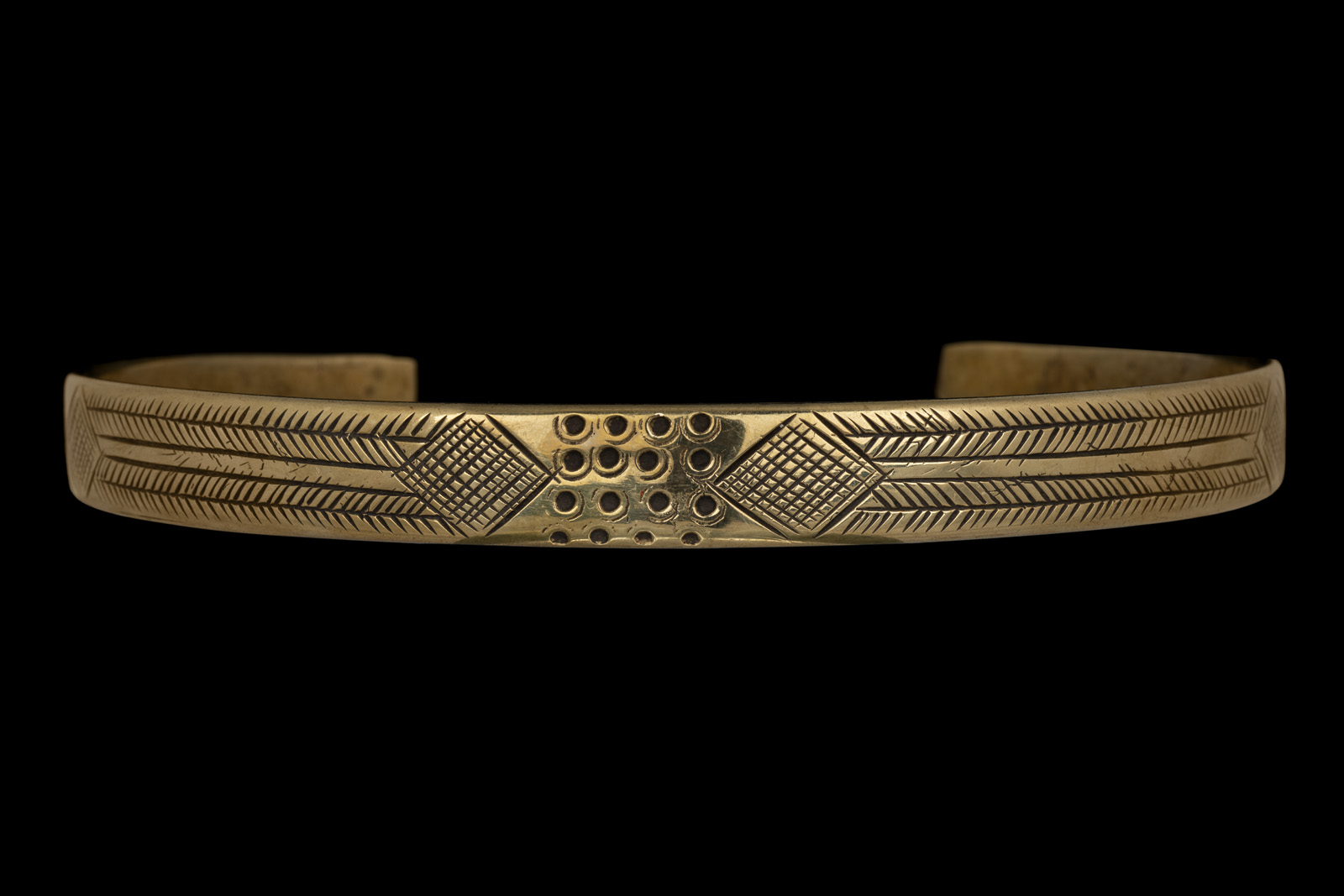An Ethiopian Brass open tapered band necklace. East Africa. The band is engraved with patterns of diamond shaped panels, square panels decorated with sixteen engraved small circles, and engraved feathered lines. The inner diameter of the band is 6.3 inches, and the band is 0.6 inches in width at the centre, tapering down to 0.3 inches at each end of the band.