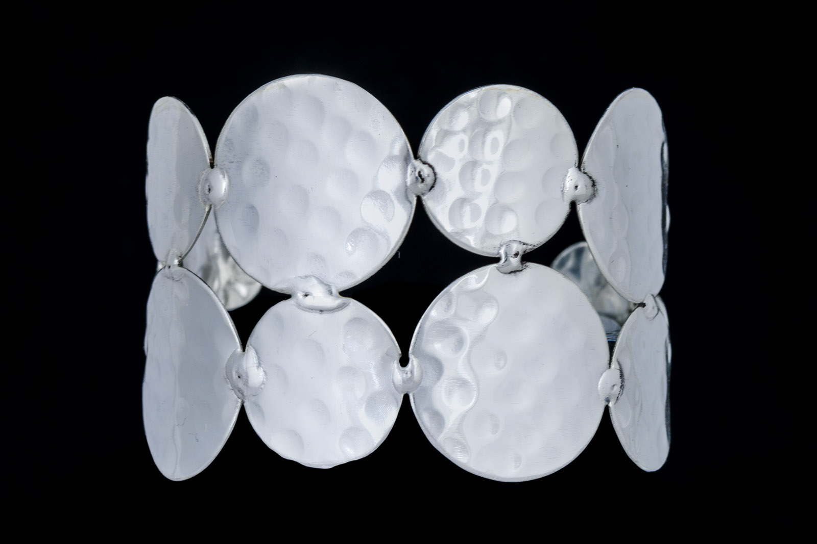 A Silvered Metal, (Nickel free), tapered open cuff of hammered surface circular discs. There are four large discs, each 1.1 inches in diameter, four medium discs, each 0.7 inches in diameter, and six small discs, each 0.5 inches in diameter. The front of the cuff is is 2 inches in width, tapering down to 0.5 inches in width, at each end of the cuff. The inner diameter of the cuff is 2.5 inches, and is adjustable in size.