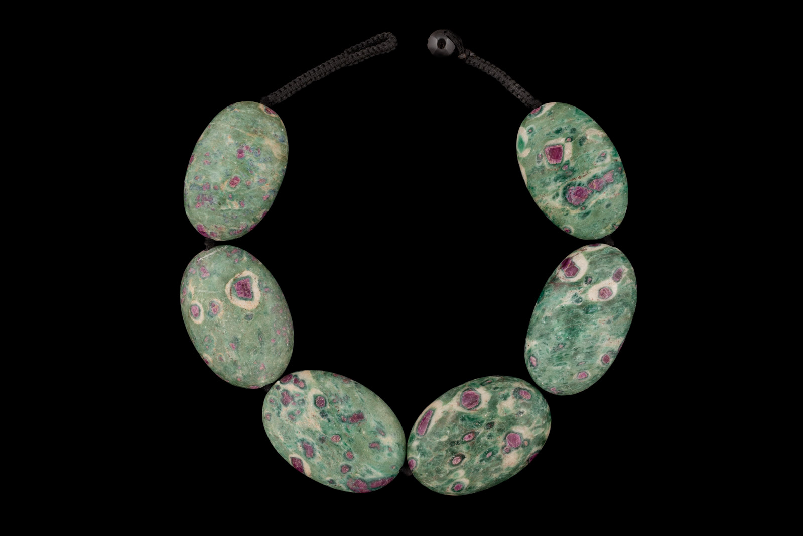 A black braided cotton knotted necklace with six graduated Ruby Fucshite large domed oval beads. The largest oval bead is 1.5 inches in width, 2.3 inches in length, and 0.6 inches in depth. The smallest oval bead is 1.4 inches in width, 2.2 inches in length, and o.5 inches in depth. The necklace is 19 inches in length, and is finished with a black cotton macrame loop, and a Black Agate round toggle.