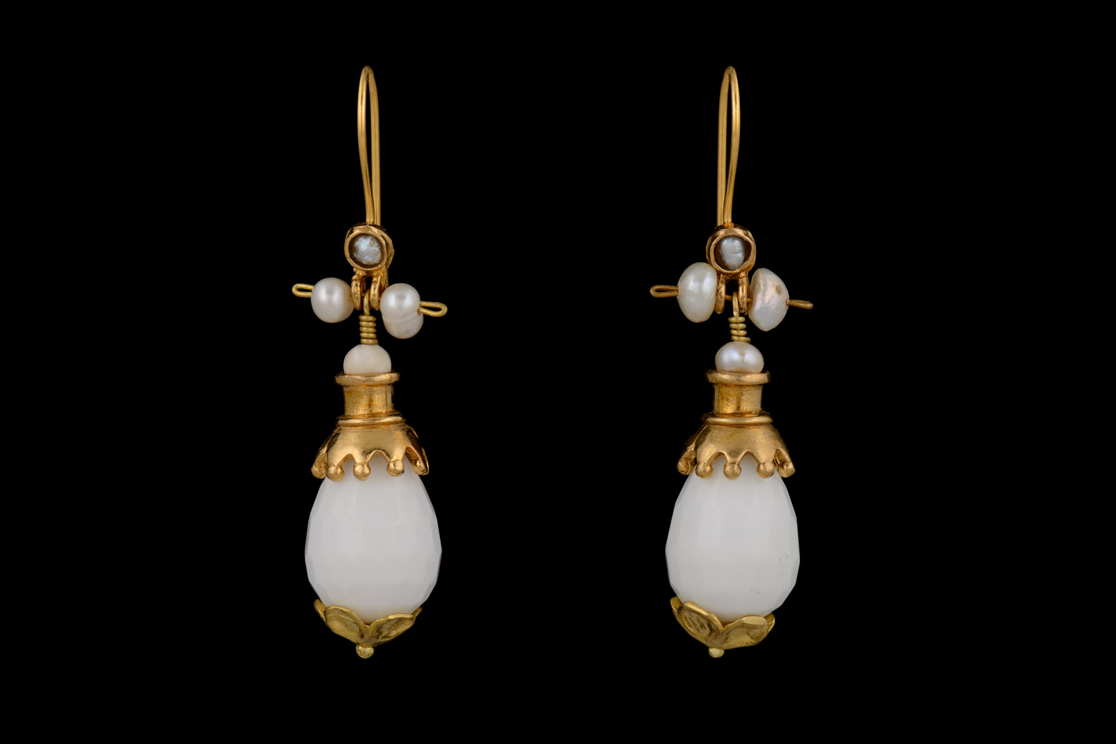 A pair of Gold Plated earrings, each with a White Agate facetted teardrop, set within a Gold Plated floral patterned top and base. The earrings are suspended from Gold Plated wire hooks, each decorated with three small white Freshwater Pearls. The earrings are 0.4 inches in diameter, and, including the hook, are 2.2 inches in drop length.