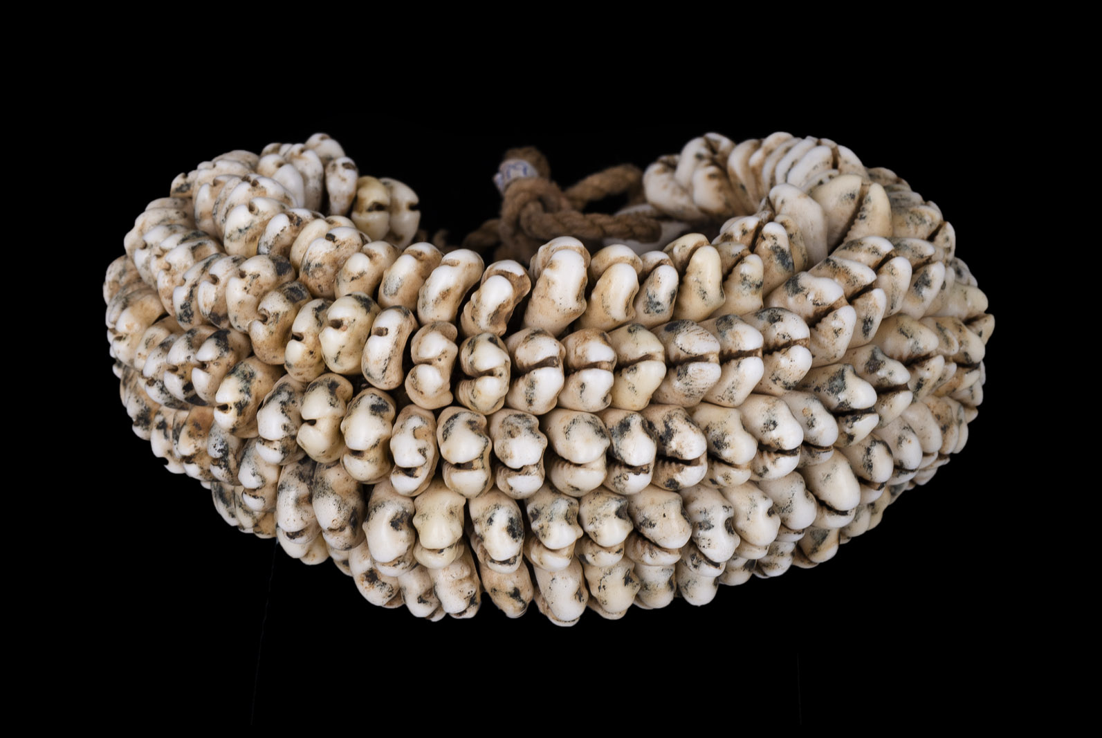 A Nigerian Old Traditional Tribal Brown Cloth Wide Bracelet Decorated With Five Bands Of Small Cream Coloured Cowrie Shells