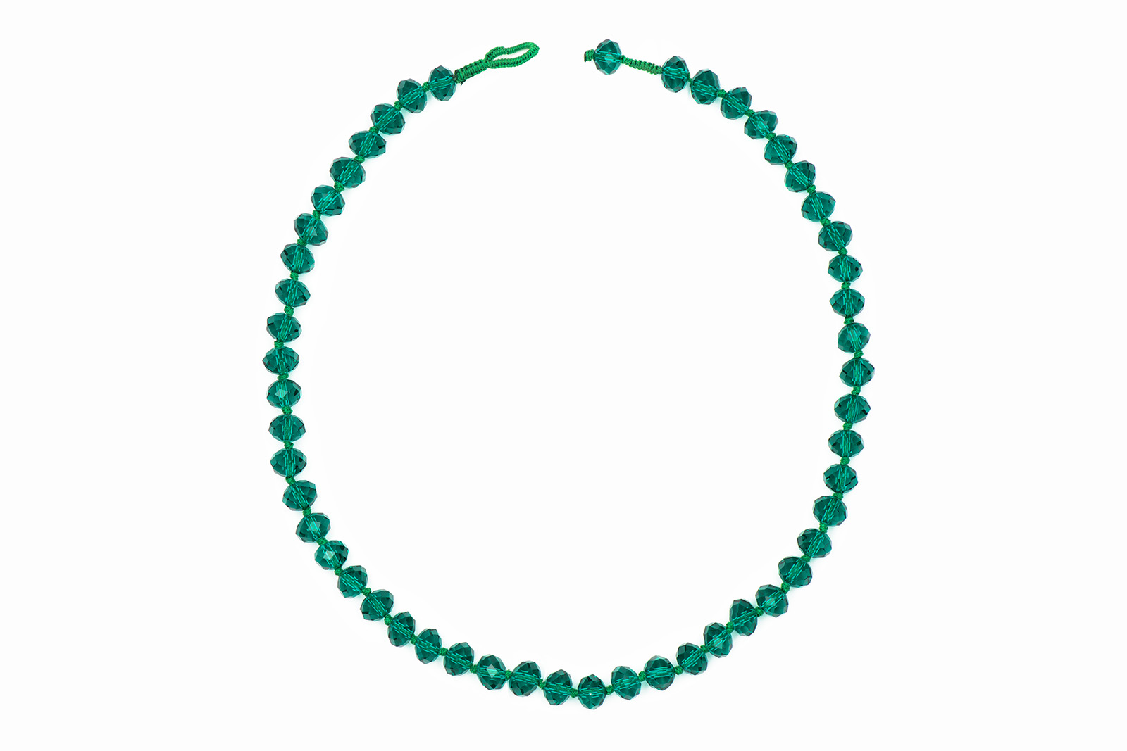 Green facetted glass button beads knotted necklace. Each Glass bead is 0.46 inches in diameter and 0.34 inches in width. The necklace is 22 inches in length, and is finished with a green cotton macrame loop, and a green facetted Glass button bead toggle.