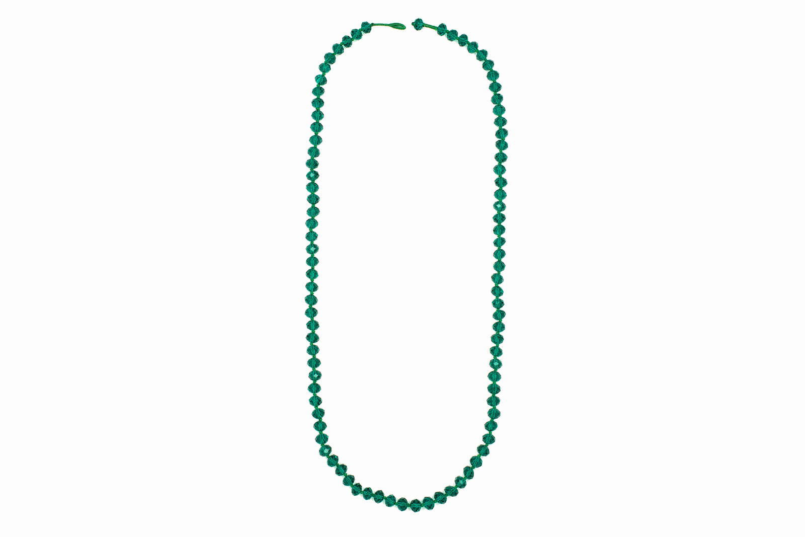 Green facetted glass button beads Long knotted necklace. Each Glass bead is 0.46 inches in diameter and 0.34 inches in width. The necklace is 40 inches in length, and is finished with a green cotton macrame loop, and a green facetted Glass button bead toggle.
