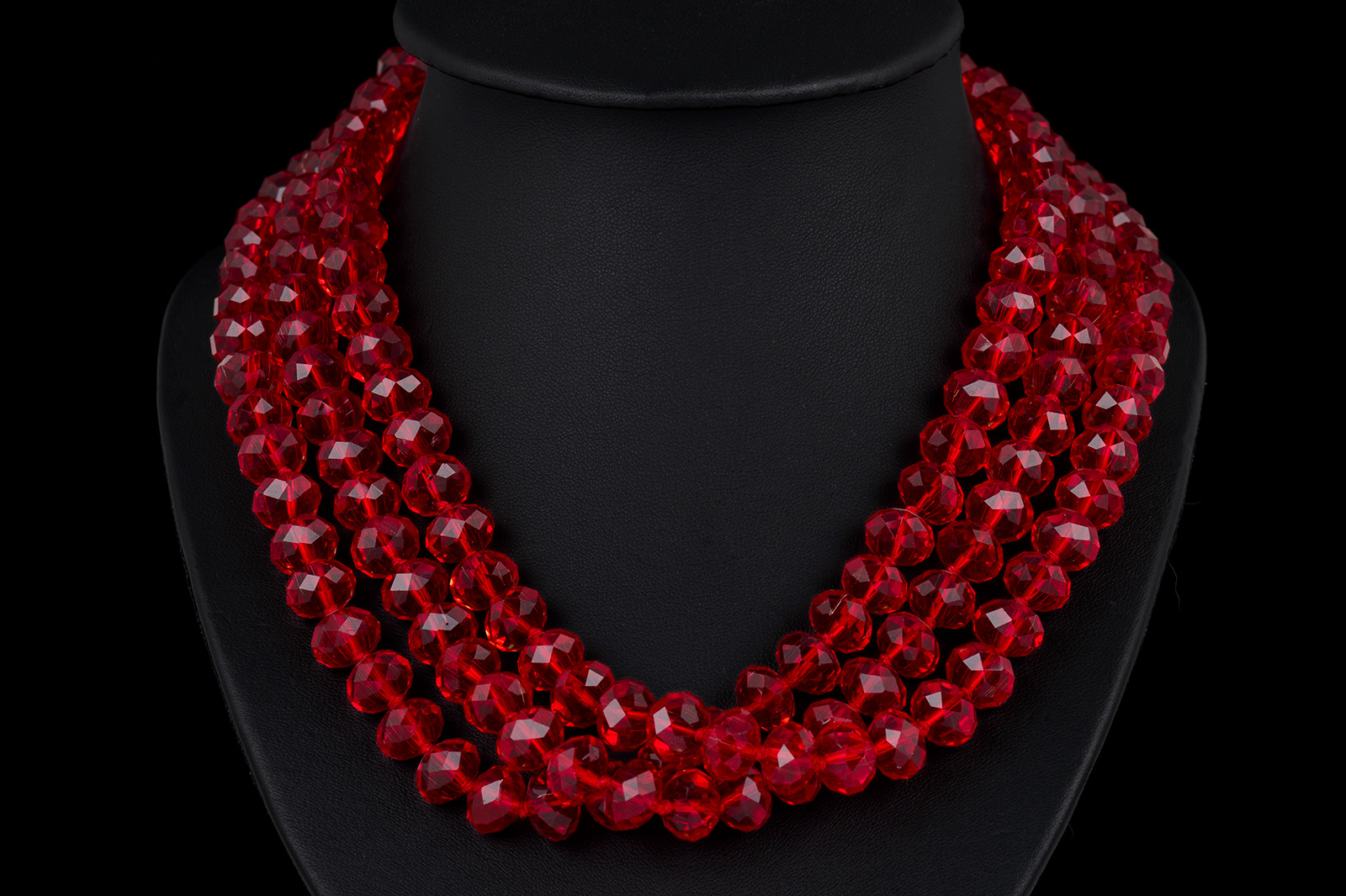 Red facetted glass button beads knotted three strand necklace. Each Glass bead is 0.46 inches in diameter and 0.34 inches in width. The necklace is 22 inches in length, and is finished with a red cotton macrame loop, and a red facetted Glass button bead toggle.