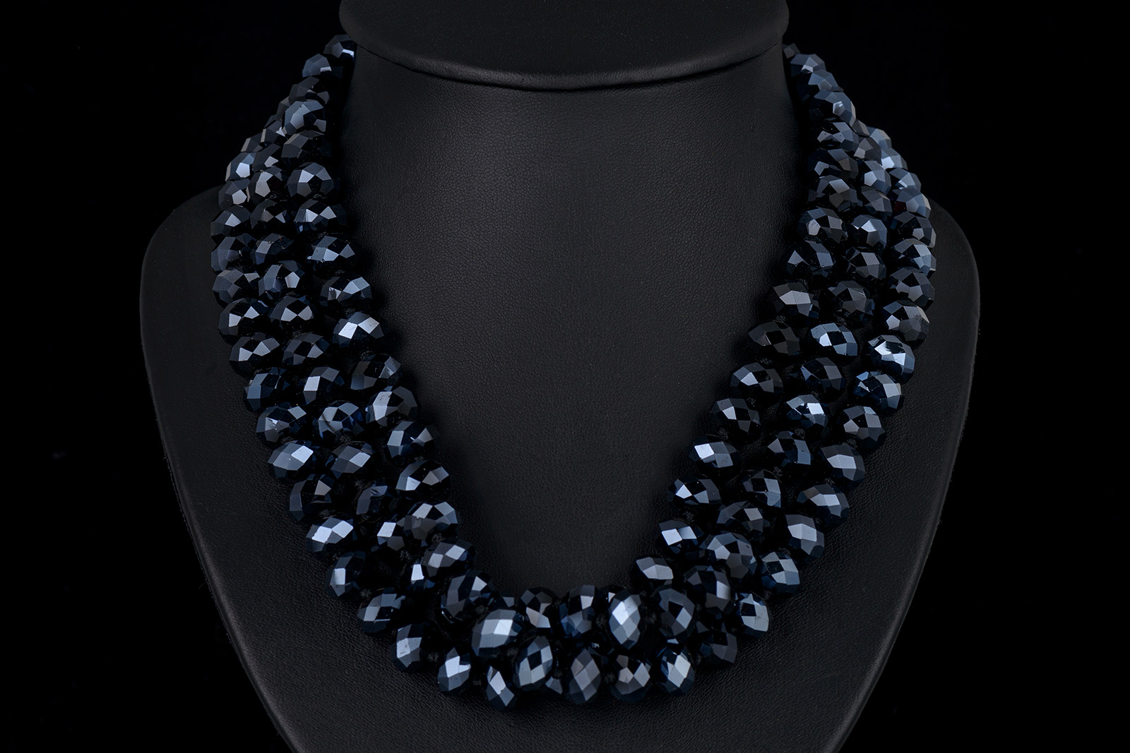 Black facetted glass button beads knotted three strand necklace. Each Glass bead is 0.46 inches in diameter and 0.34 inches in width. The necklace is 22 inches in length, and is finished with a black cotton macrame loop, and a black facetted Glass button bead toggle.