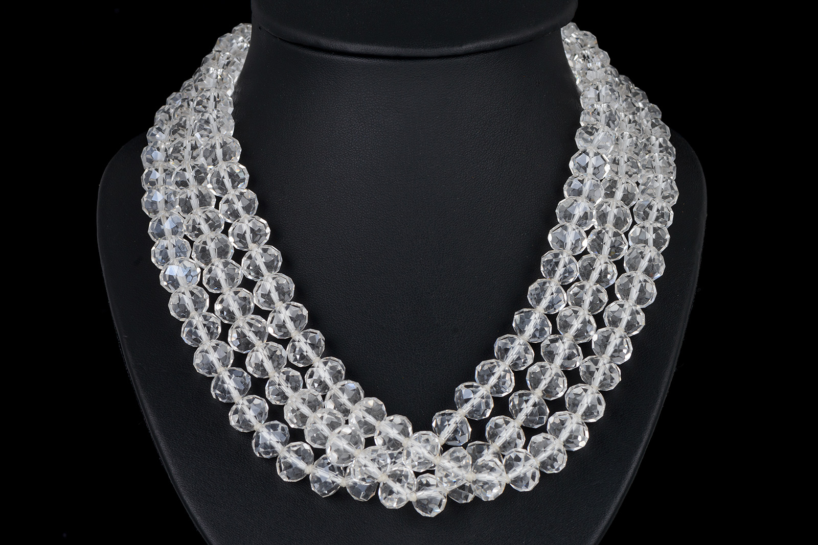Clear facetted glass button beads knotted three strand necklace. Each Glass bead is 0.46 inches in diameter and 0.34 inches in width. The necklace is 22 inches in length, and is finished with a white cotton macrame loop, and a clear facetted Glass button bead toggle.