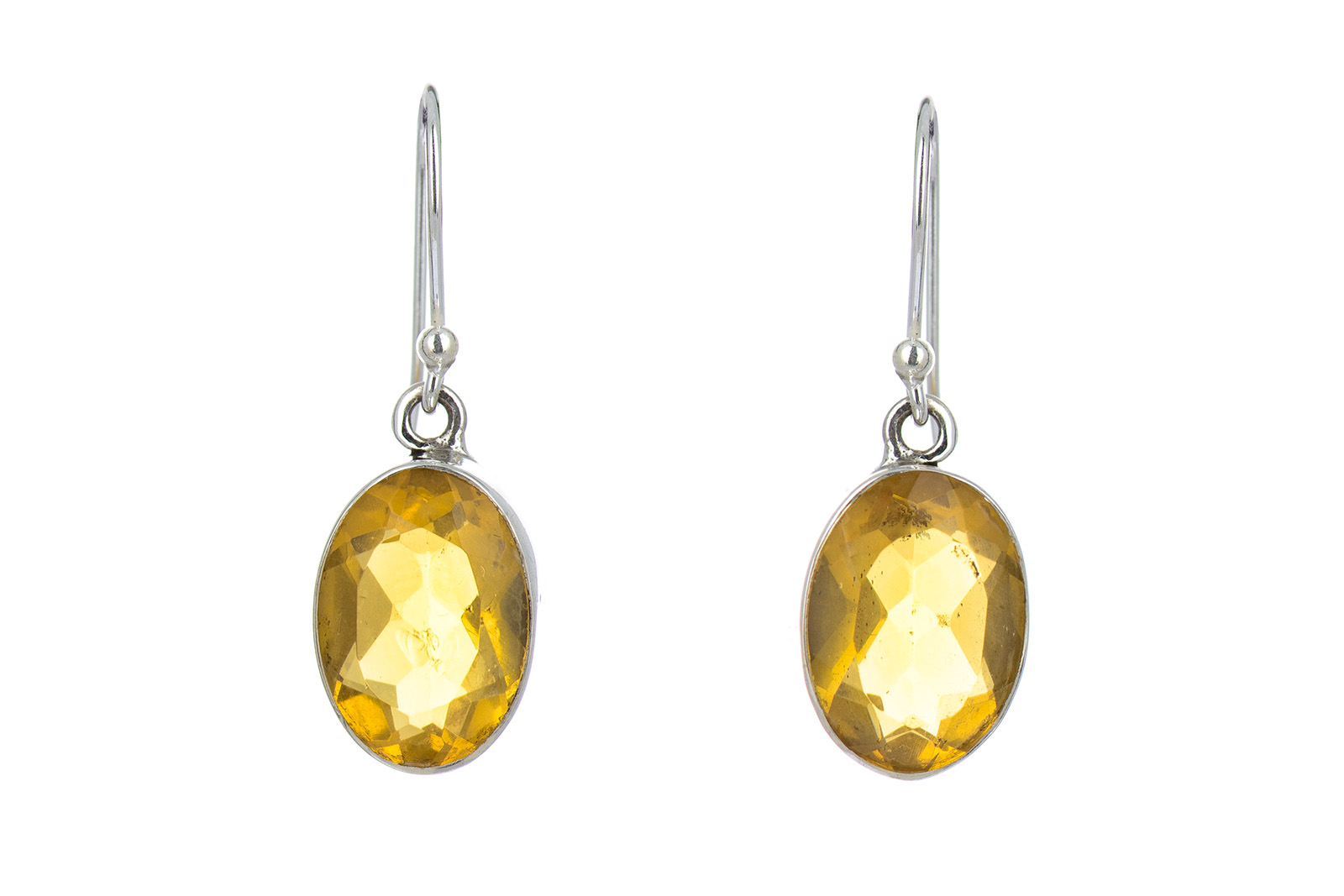 A pair of Silver oval band earrings, each inlaid with a Golden Citrine domed oval facetted cabochon. The earrings are suspended from Slyer wire hooks. Each earring is 0.3 inches in width, 0.2 inches in depth, and, including the wire hook, 1.2 inches in drop length.