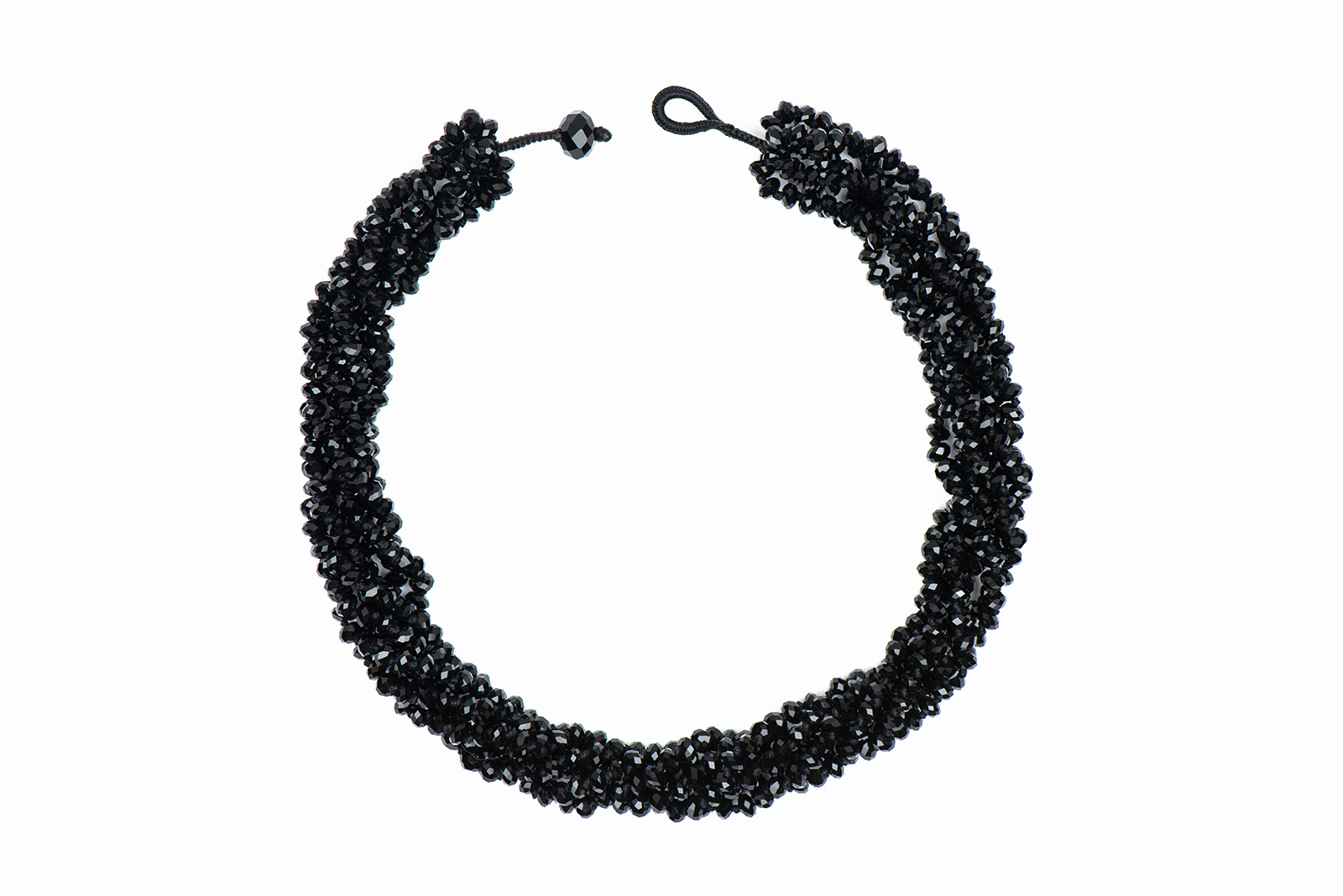 A necklace with seven kn0tted strands of small black facetted Glass rondel beads. Each Glass bead is 0.2 inches in diameter and 1 inch in width. The necklace is 20.4 inches in length, and is finished with a black cotton macrame loop, and a black facetted Glass rondel toggle.