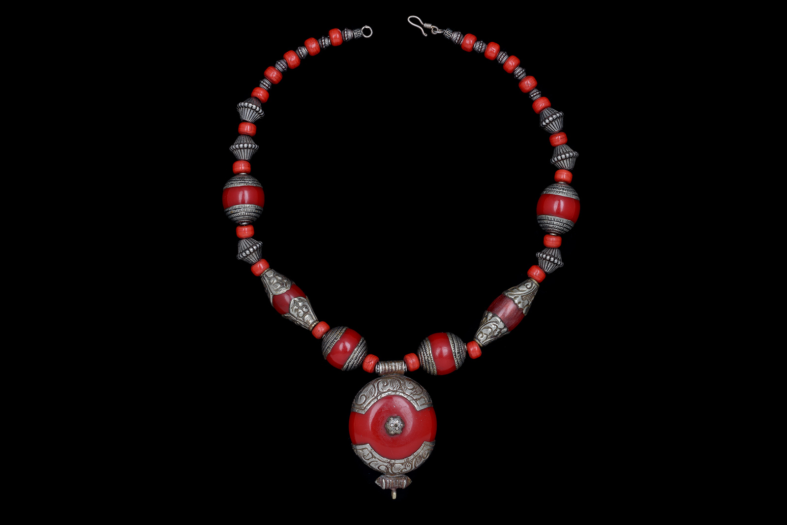 An Afghan necklace with four round red Resin beads with patterned Silver Plated tips, two long red Resin oval beads with patterned Silver Plated tips, six Silver Plated grooved beads with patterned ridges, twenty-two small red Resin barrel beads, and eight small Silvered Metal grooved beads with patterned ridges. Suspended from the base of the necklace, by a Silver Plated patterned tube, is a large circular pendant of red Resin with Silver Plated patterned borders, and a small Silver Plated domed star shaped panel in the centre of both sides of the pendant. The pendant is 1.5 inches in diameter, 0.6 inches in depth, and, including the patterned tube, 2.5 inches in drop length. The necklace is 20.4 inches in length, and is finished with a Silver Plated hook and ring.