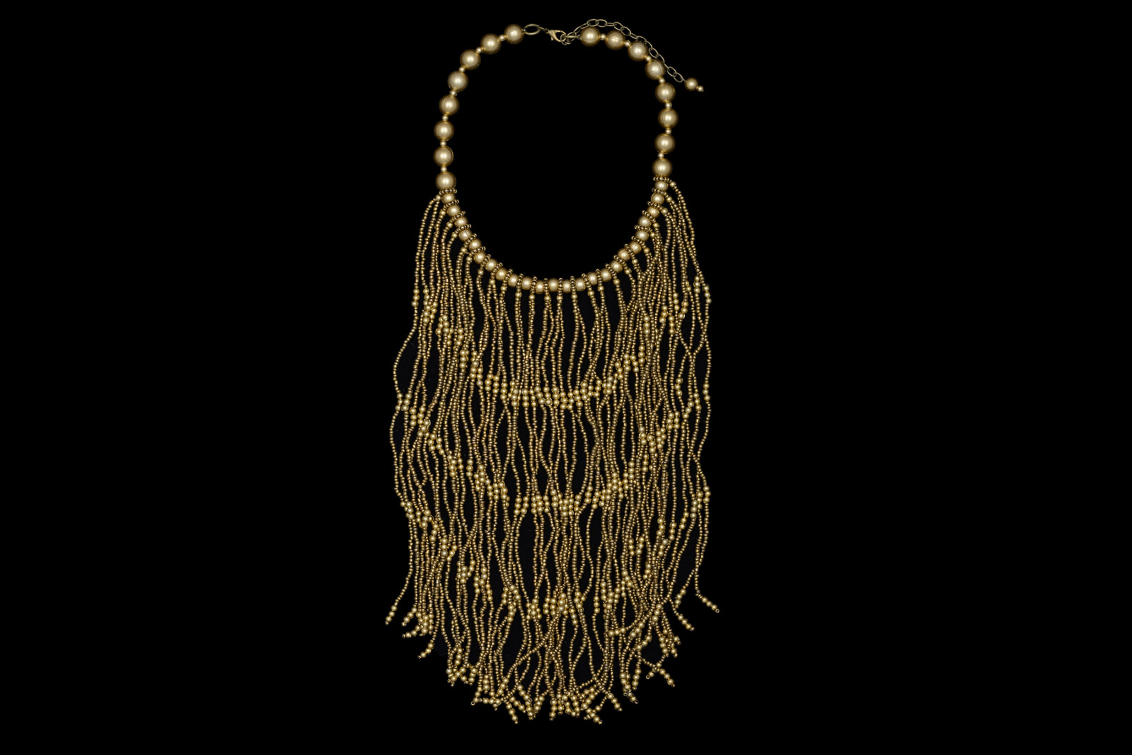A necklace of large matt Golden Metal, (Nickel free) round beads with small matt Golden Metal round beads spacers. Suspended from the base of the necklace , is a fringe of fifty long strands of small gold Resin beads and small matt Golden Metal round beads. The beaded strands are hung in pairs, between Golden Metal bead spacers. Each strand of gold beads is 10 inches in drop length. The necklace is 17 inches in length, and is finished with a Golden Metal oyster clasp, and a 4 inch chain, (for adjustable sizing).