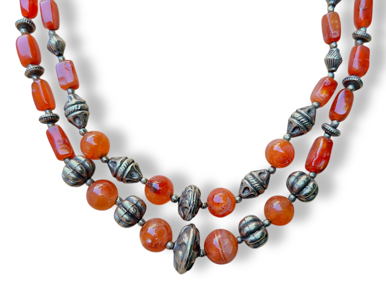 One Afghan two strand long necklace of twenty-five Cornelian long facetted rectangular beads, eight Cornelian round beads, ten Silvered Metal patterned disc beads, four Silvered Metal melon cut beads, six Silvered Metal striped ridged beads, four Silvered Metal patterned oval beads, two Silvered Metal large patterned disc beads, and seventy-two small Silvered Metal round spacers and beads. Each Cornelian rectangular bead is, approximately, 1.2 cm in length, and each Cornelian round bead is 1.6 cm in diameter. The necklace is 33 cm in drop length, and is attached at the top of the necklace, by a Silvered Metal bar and ring