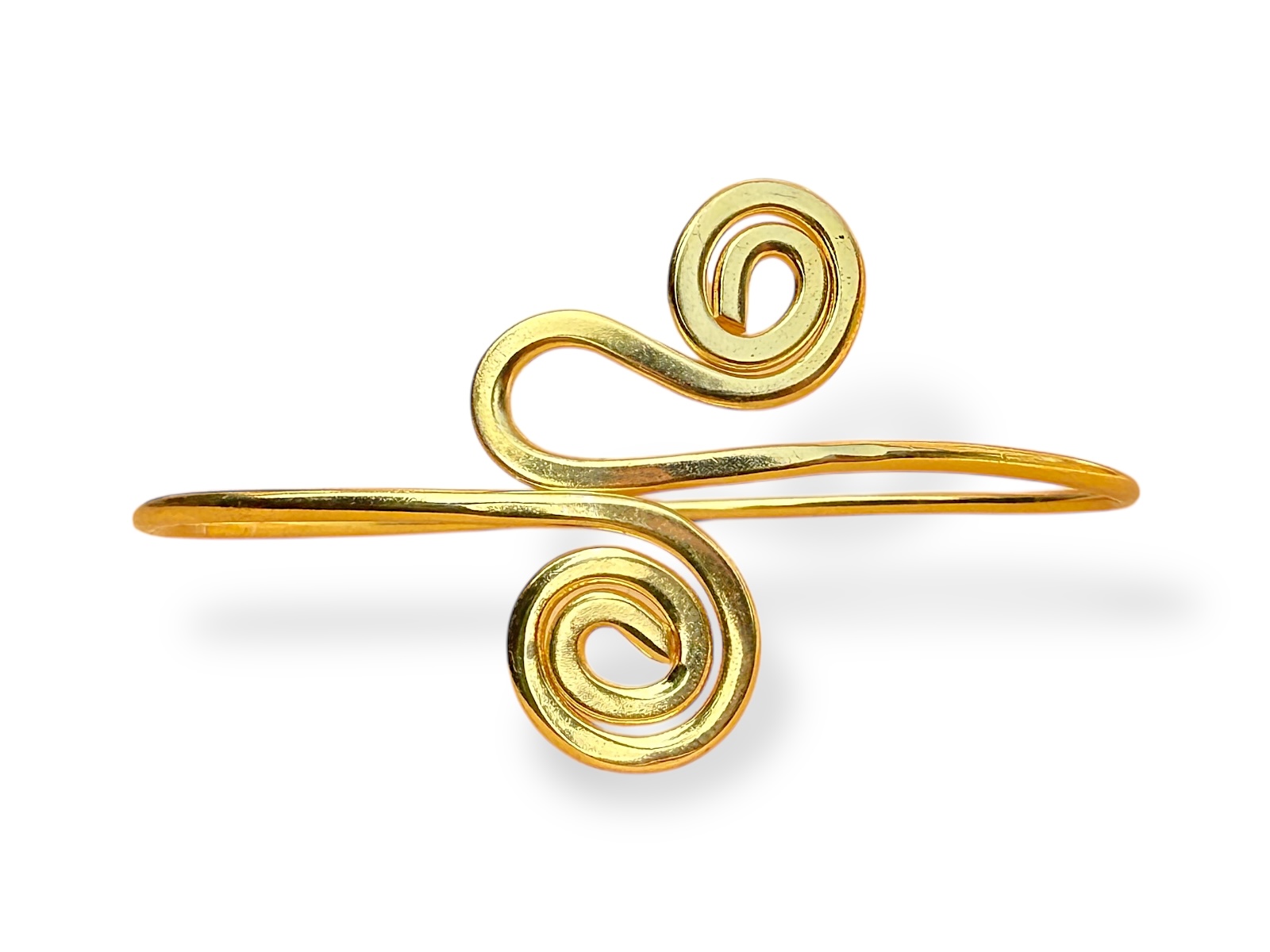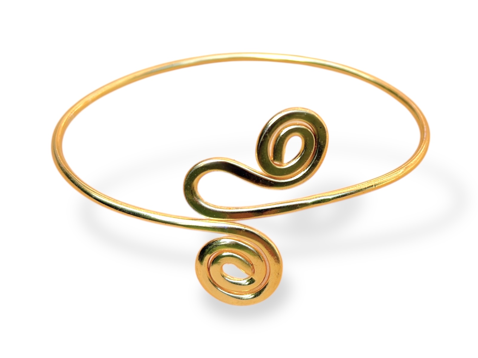 One Gold Plated band open cuff/armlet, with a coiled band at each end of the cuff. The diameter of the two coiled bands is 1.8 cm, and the inner diameter of the cuff is 7.8 cm, and is adjustable in size.