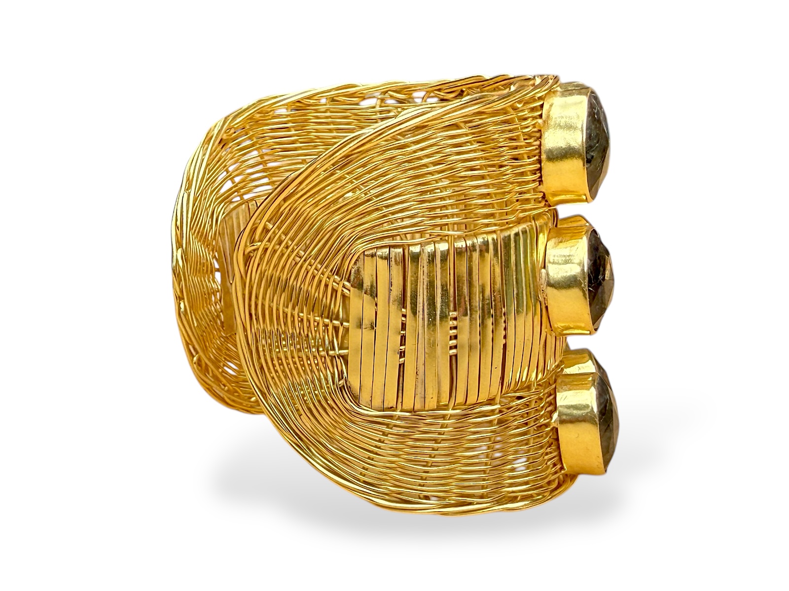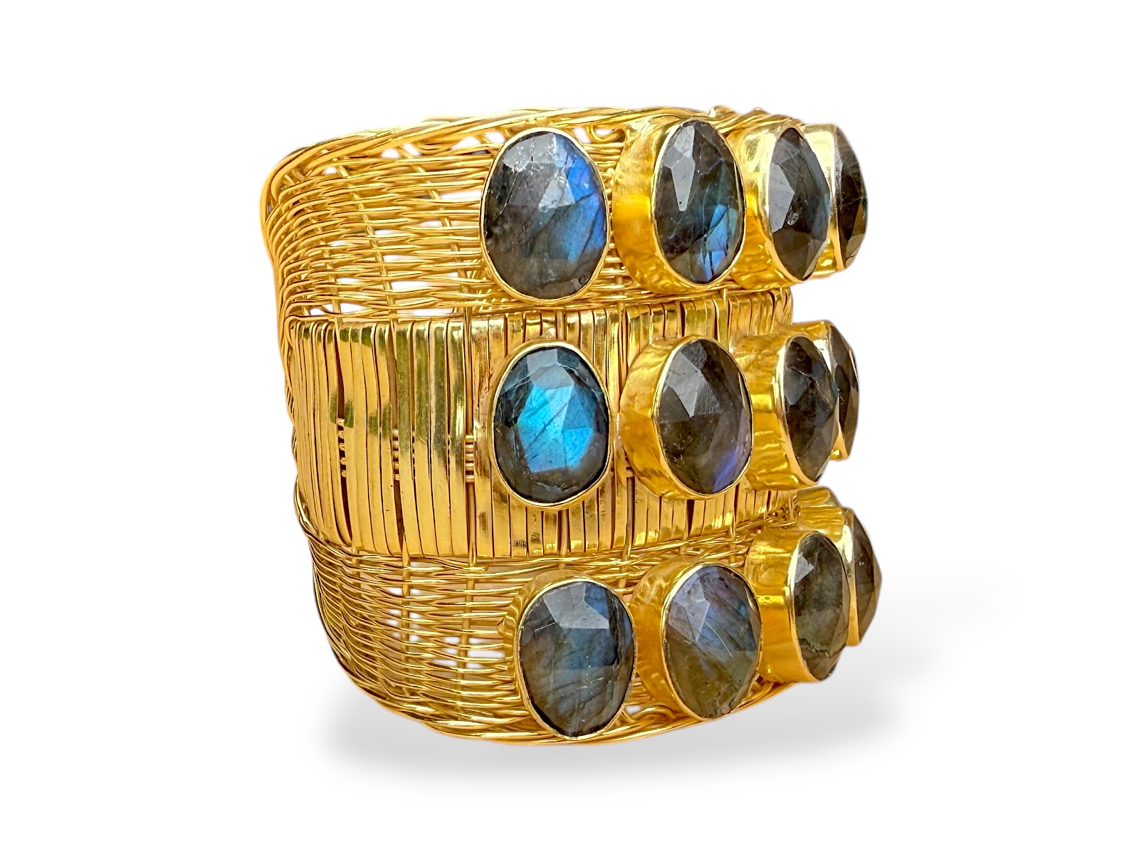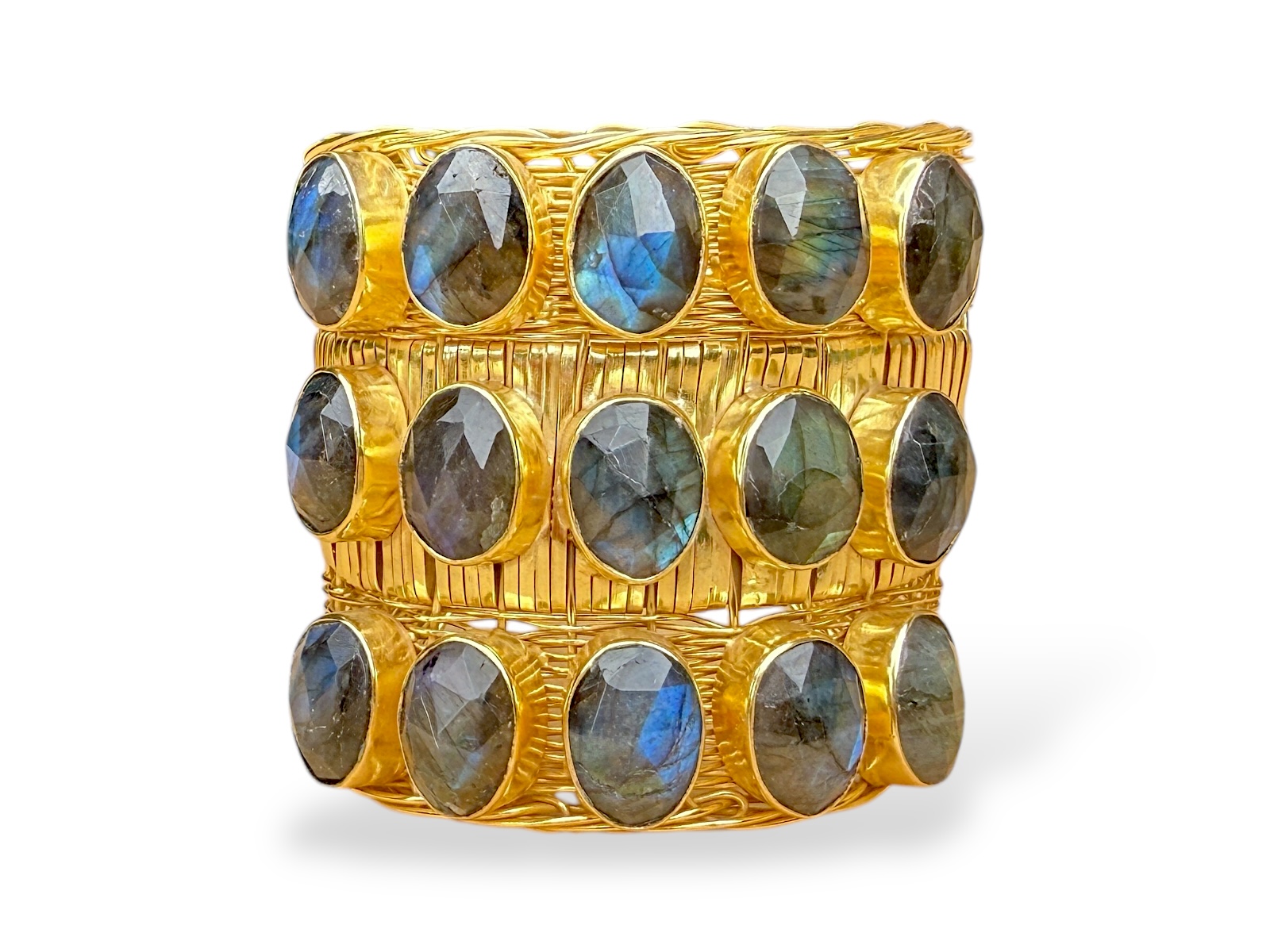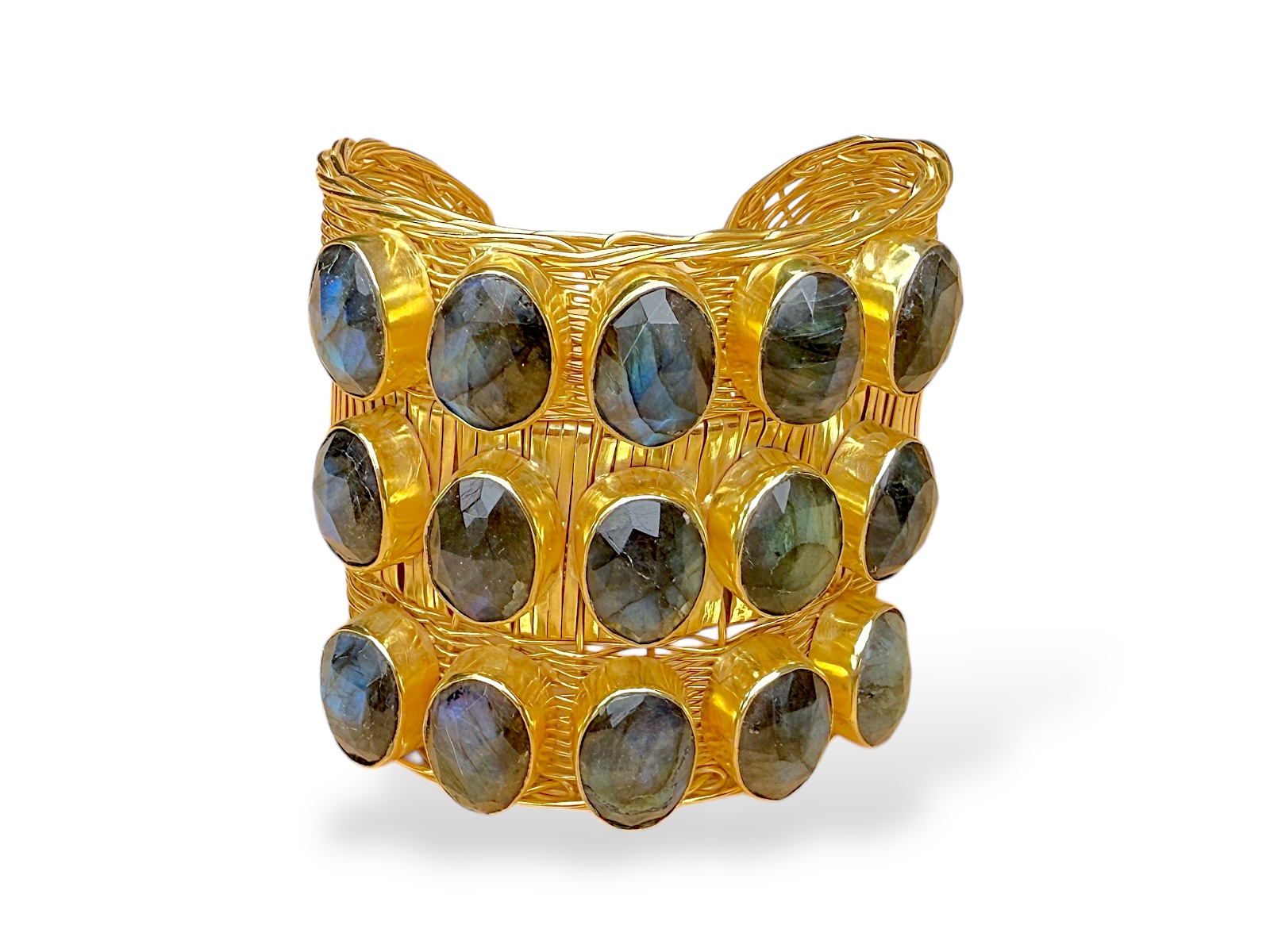 One Gold Plated braided bands open cuff, decorated with fifteen Madagascar Labradorite facetted domed oval beads, each set in a raised Gold Plated frame. Each framed Labradorite oval bead is 1.2 cm in width, 1.5 cm in length, and 0.5 cm in height. The band of the cuff is 6 cm in width and has semi circular ends. The inner diameter of the cuff is 5.5 cm, and is adjustable in size.