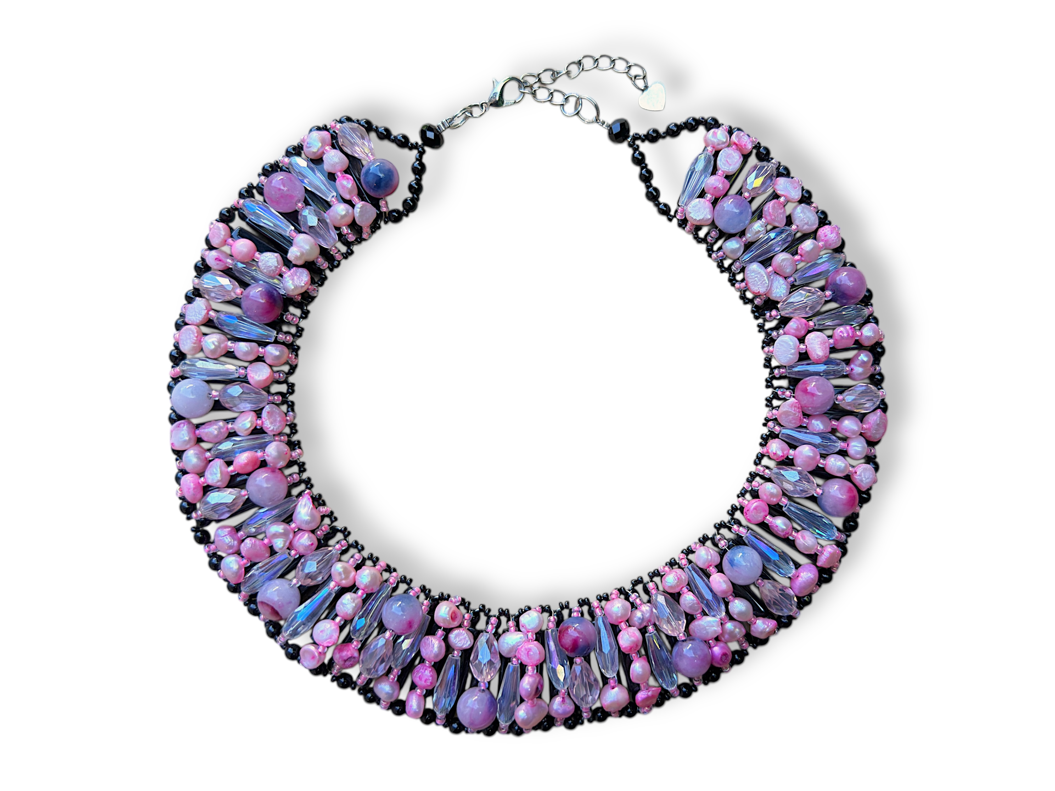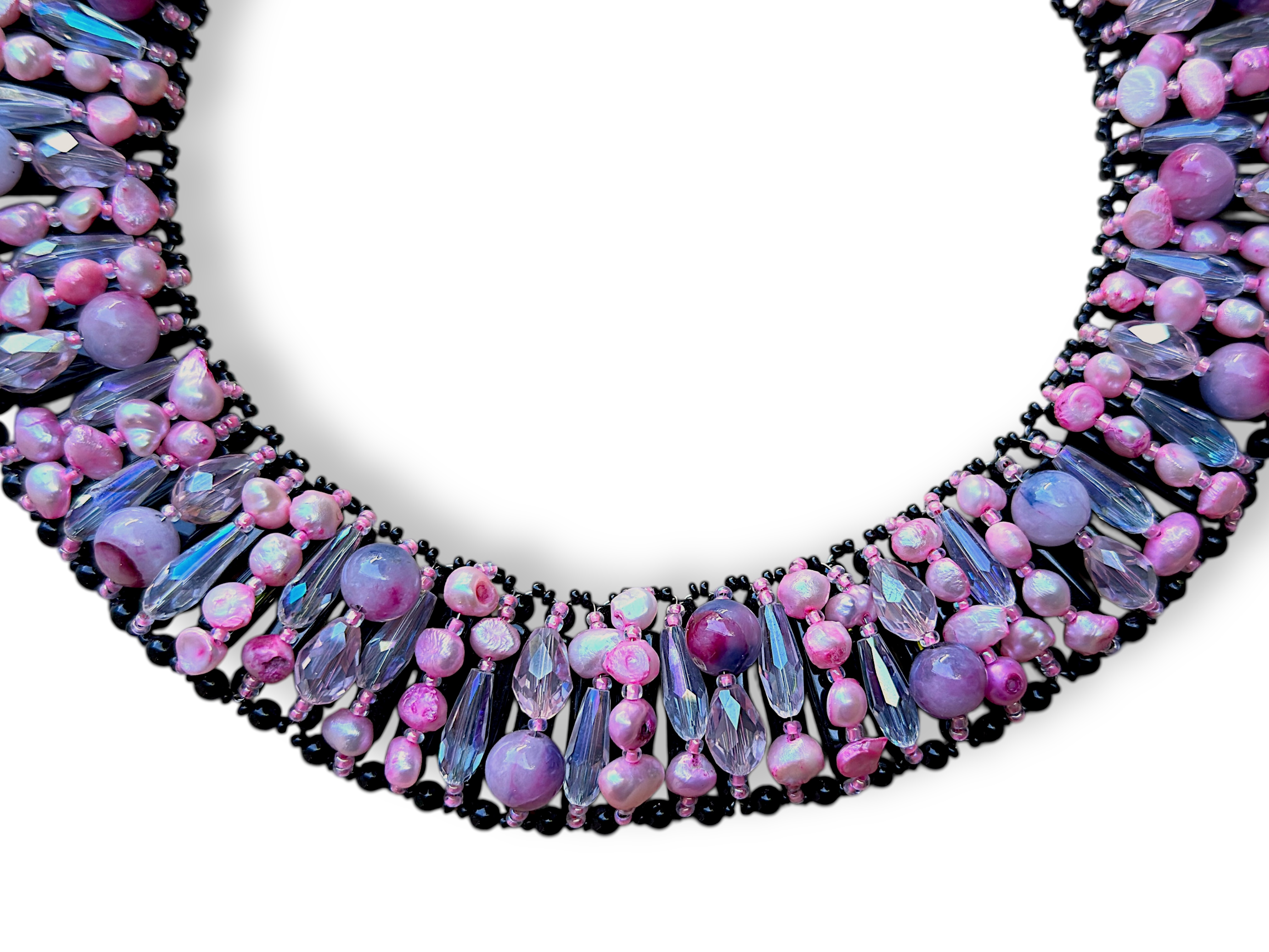 One Thai curved wide band necklace, decorated with lines of pink dyed Freshwater Pearls, clear facetted Glass teardrop shaped beads, and pink and mauve round Glass beads. At the back of the necklace are bands of rectangular black Glass beads and borders of small round black Glass beads. The band of the necklace is 3cm in width.  The inner diameter of the necklace is adjustable from 12 cm to 14 cm, and the necklace is attached by a Silvered Metal, (Nickel free),oyster clasp, and a 7.5 cm chain, (for adjustable sizing).
