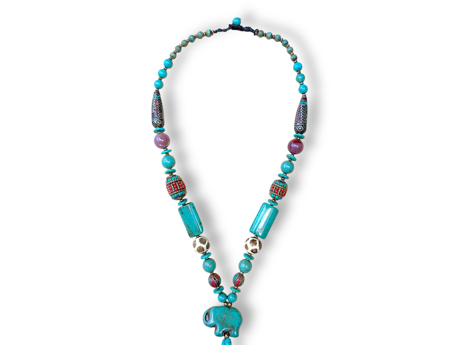 One Tibetan Cowrie Shell pendant, decorated with Silver floral patterned panels,  and Turquoise rectangular sliced inlays. At the centre of the pendant is a six petalled flower, the petals inlaid with red Glass slices,, and each petal inlaid with a Tibetan Brass script. The circular centre of the flower is inlaid with Turquoise slices and a Silver Tibetan script. The pendant is suspended from a long necklace of mixed shaped and sized Turquoise beads, two barrel beads inlaid with a pattern of small Turquoise, red Glass and Silver round beads, two long teardrop shaped beads inlaid with patterns of coiled Silver bands, and Turquoise chips, two white and brown patterned round Glass beads, and a Turquoise elephant pendant. The Cowrie Shall pendant is 5 cm in maximum diameter, and 15 cm in drop length. The necklace and pendant have a total drop length of 46 cm, and the necklace is attached, at the top, by a braided brown Leather loop, and a Turquoise round bead toggle.