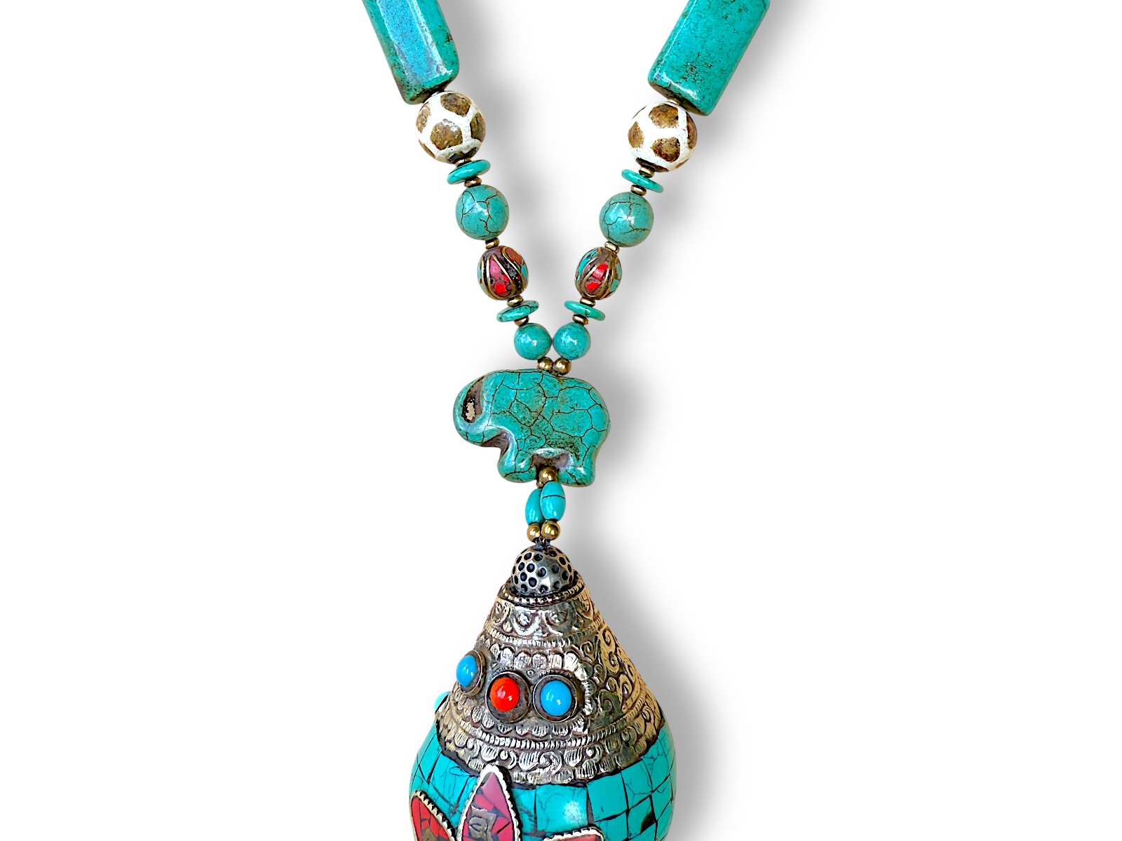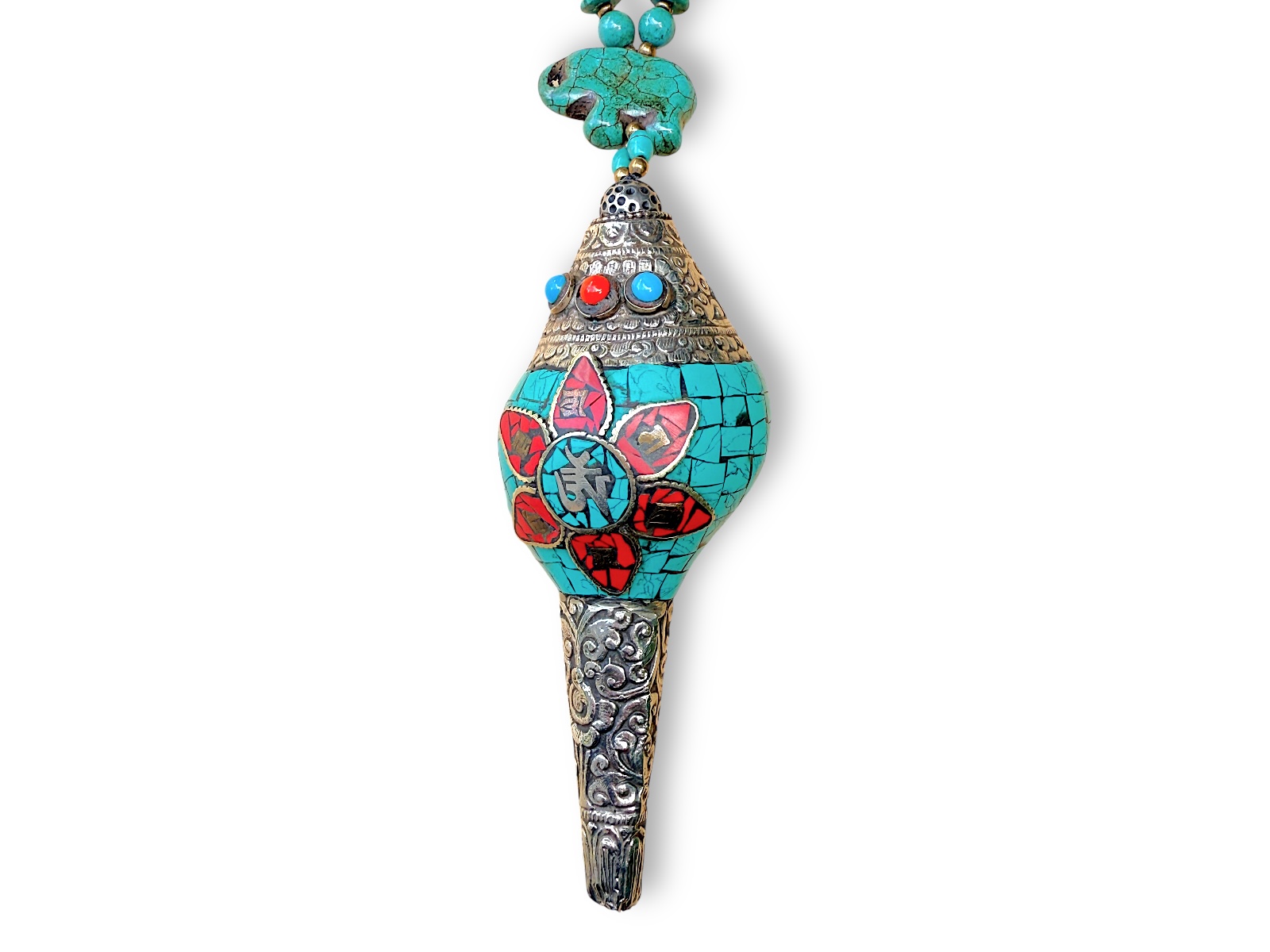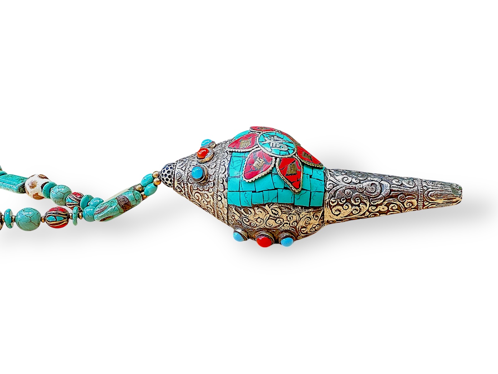 One Tibetan Cowrie Shell Pendant With Silver Patterned Panels AndTurquoise And Red Glass Inlays.On A Long Necklace Of Turquoise Mixed Shaped Beads.
