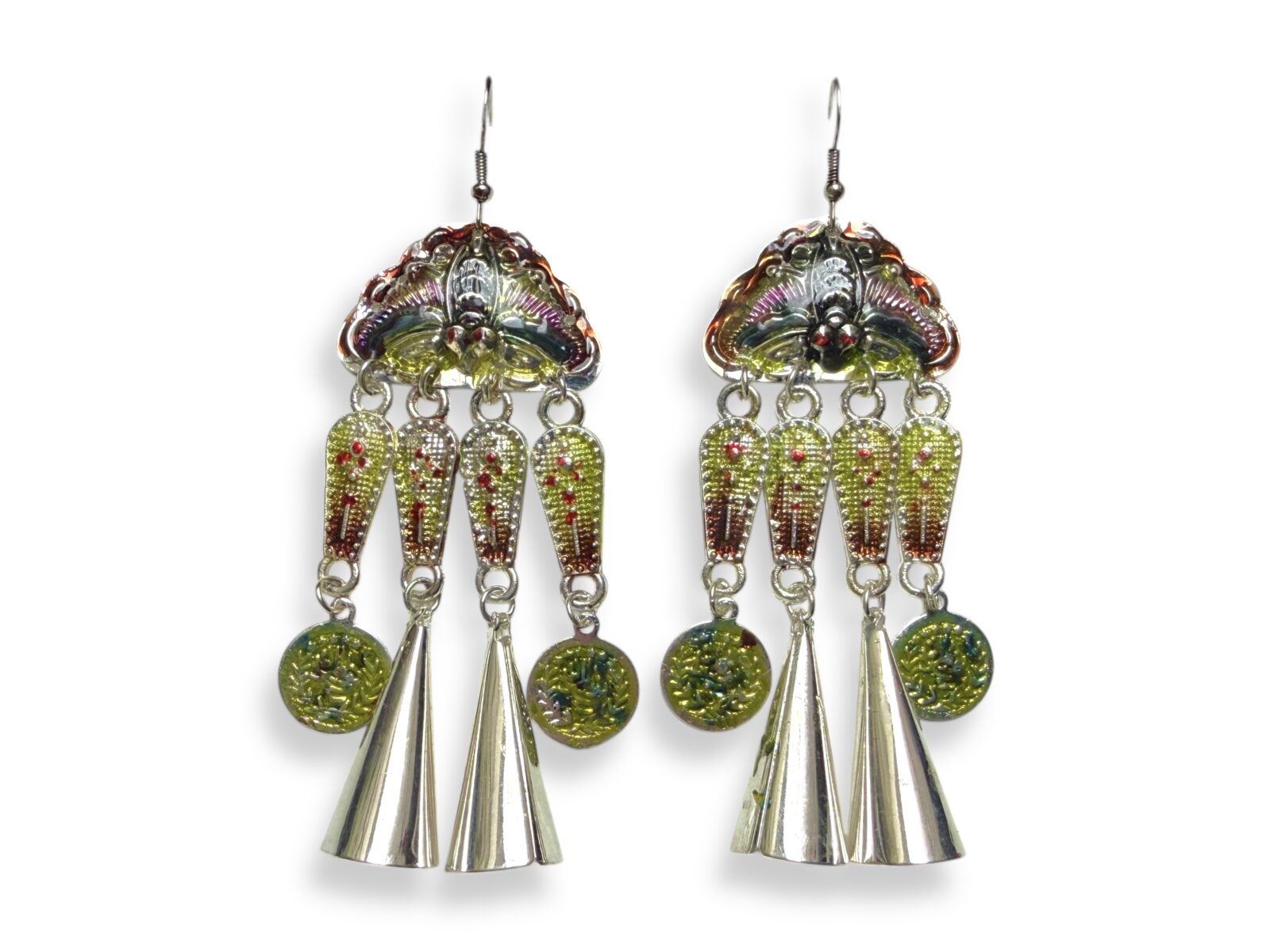Silvered metal painted enamel earrings, with a painted butterfly top and long painted pendants with coins and cones