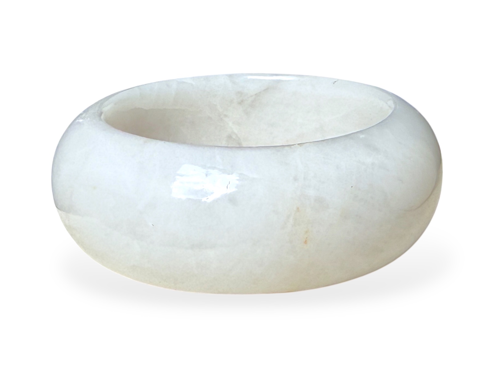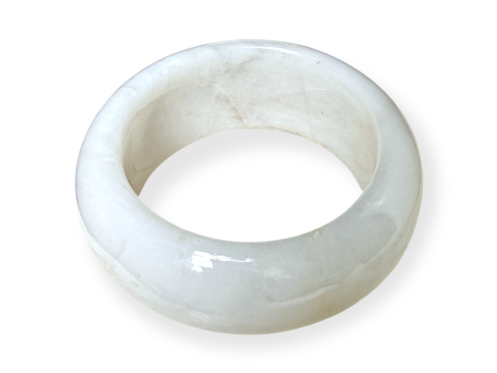 A white Agate wide curved band bangle. The inner diameter of the band of the bangle is 6.2 cm, and the width of the band of the bangle is 3 cm.